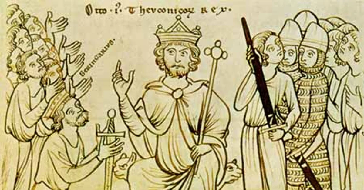 Berengar II (r. 950–961) of Italy submits to Otto I, Holy Roman Emperor (962-973), labelled here as Teutonicorum rex, or King of the Germans, in 964. From the Chronicle of Bishop Otto of Freising (Manuscriptum Mediolanense), unknown artist, 12th century.