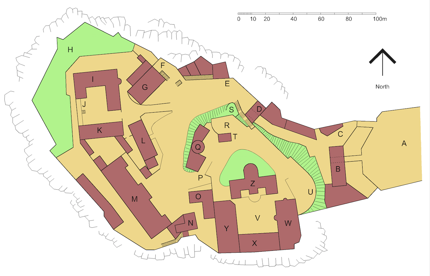 A plan of the buildings and layout of Edinburgh Castle, Scotland. Although occupied since the Bronze Age and site of a medieval castle from the 11th century, most of the structures today date from around 1500 with additions and modifications made over subsequent centuries.