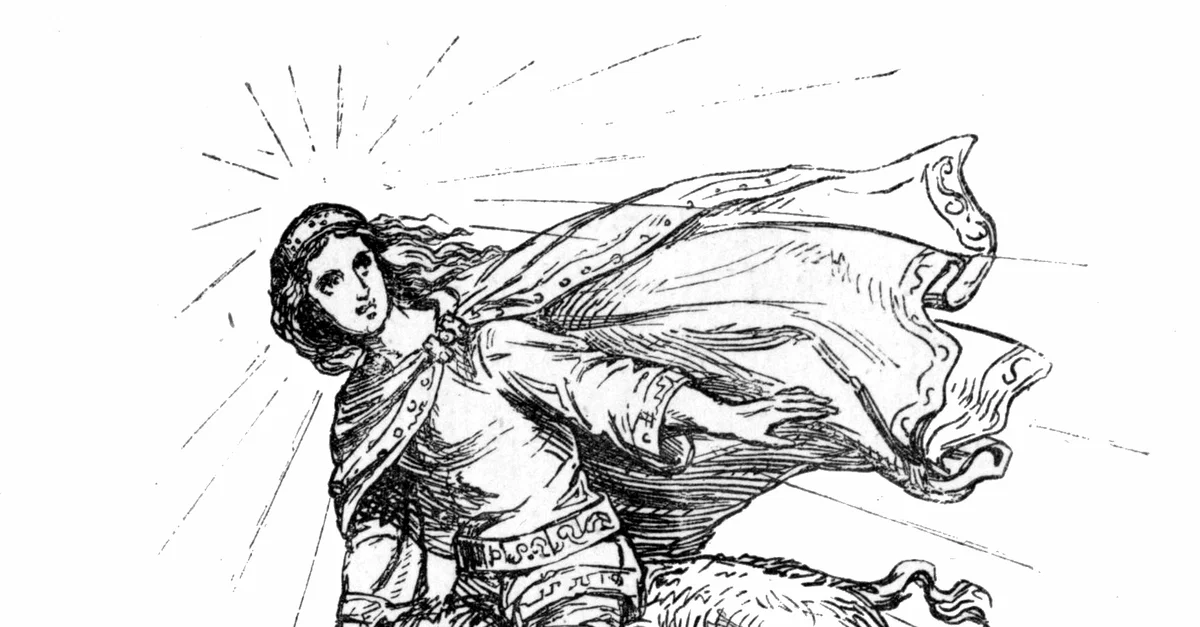 Drawing of the Norse god Freyr by Ludwig Pietsch, 1865 CE. According to the Prose Edda, Freyr received the boar Gullinbursti as a result of a contest between dwarves and their creation, instigated by Loki.
