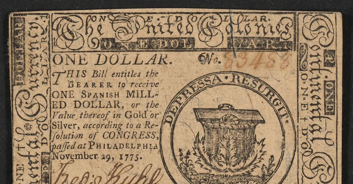An eight-dollar bill minted by the Continental Congress in 1775. Collection of the Baker Library, Harvard Business School.