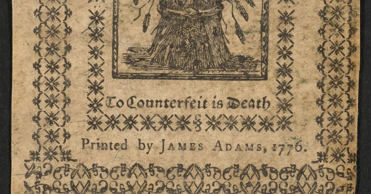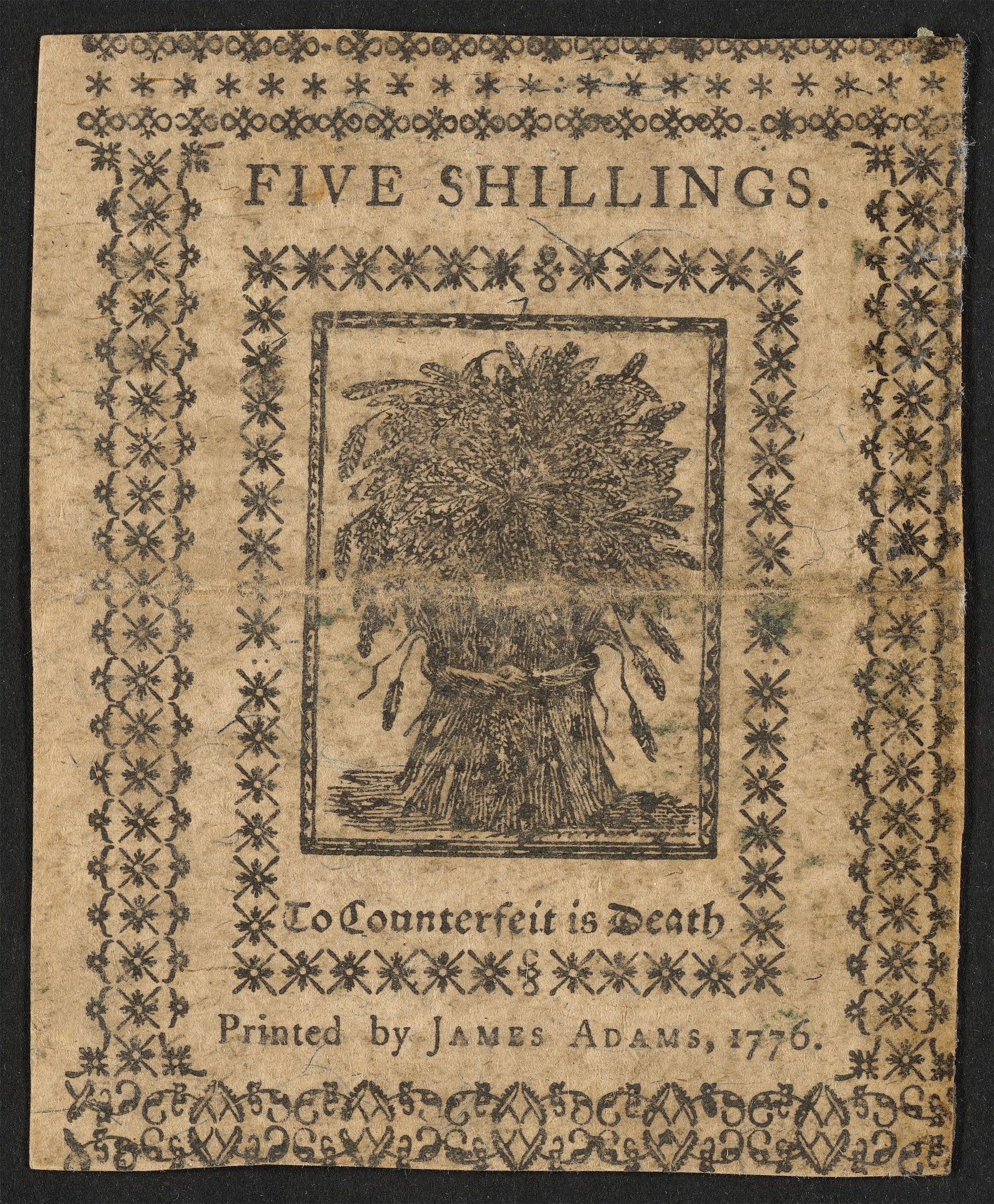 A Delaware bill worth five shillings. The bottom caption reads: "To Counterfeit is Death". Minted in Delaware by James Adam (1724-1792 CE) under the authority of George III of Great Britain and Ireland (r. 1760–1820 CE). Collection of the Baker Library, Harvard Business School.