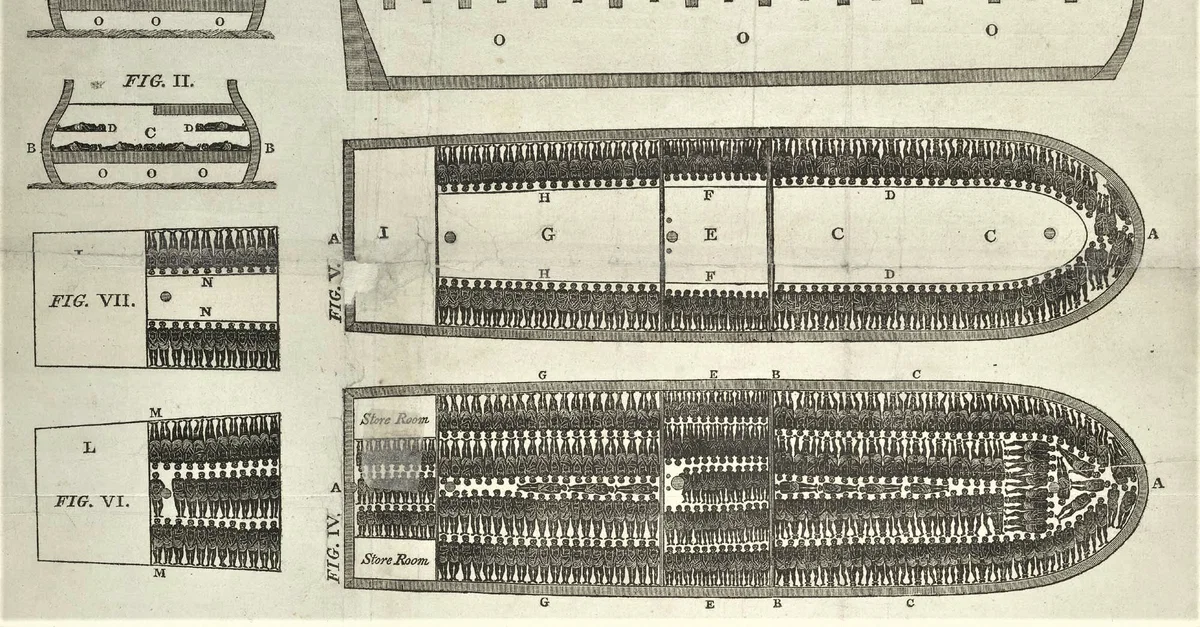 A diagram of the Brooks (or Brookes), a British slave ship launched in 1781 CE. This ship carried enslaved African people on a brutal journey across the Atlantic during the 18th Century CE. Diagram created in 1787 CE, depicting the inhumane manner in which enslaved people were transported.