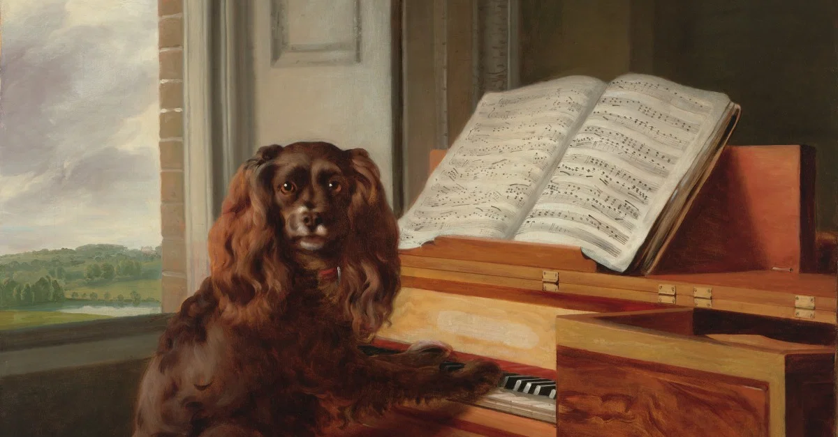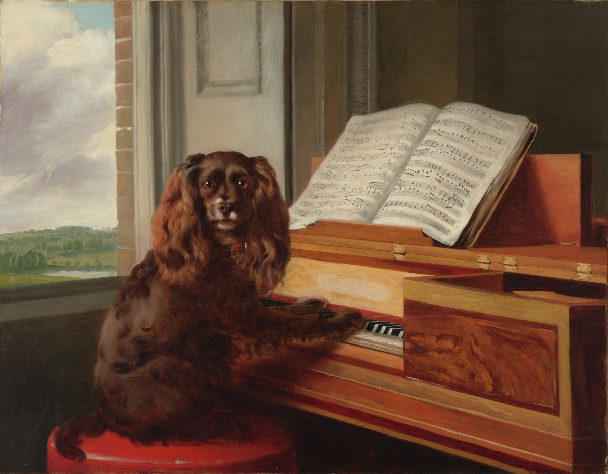 An 1805 oil-on-canvas painting by the English artist Philip Reinagle (1749-1833) known as Portrait of an Extraordinary Musical Dog. The purpose of the portrait is debated since it could be the artist's sense of humour on show , a mere desire to show a particualrly fine specimen of a spaniel, or there may be a more subtle political message being sent against royalist opponents (the music has been identified by some as 'God Save the King/Queen).
