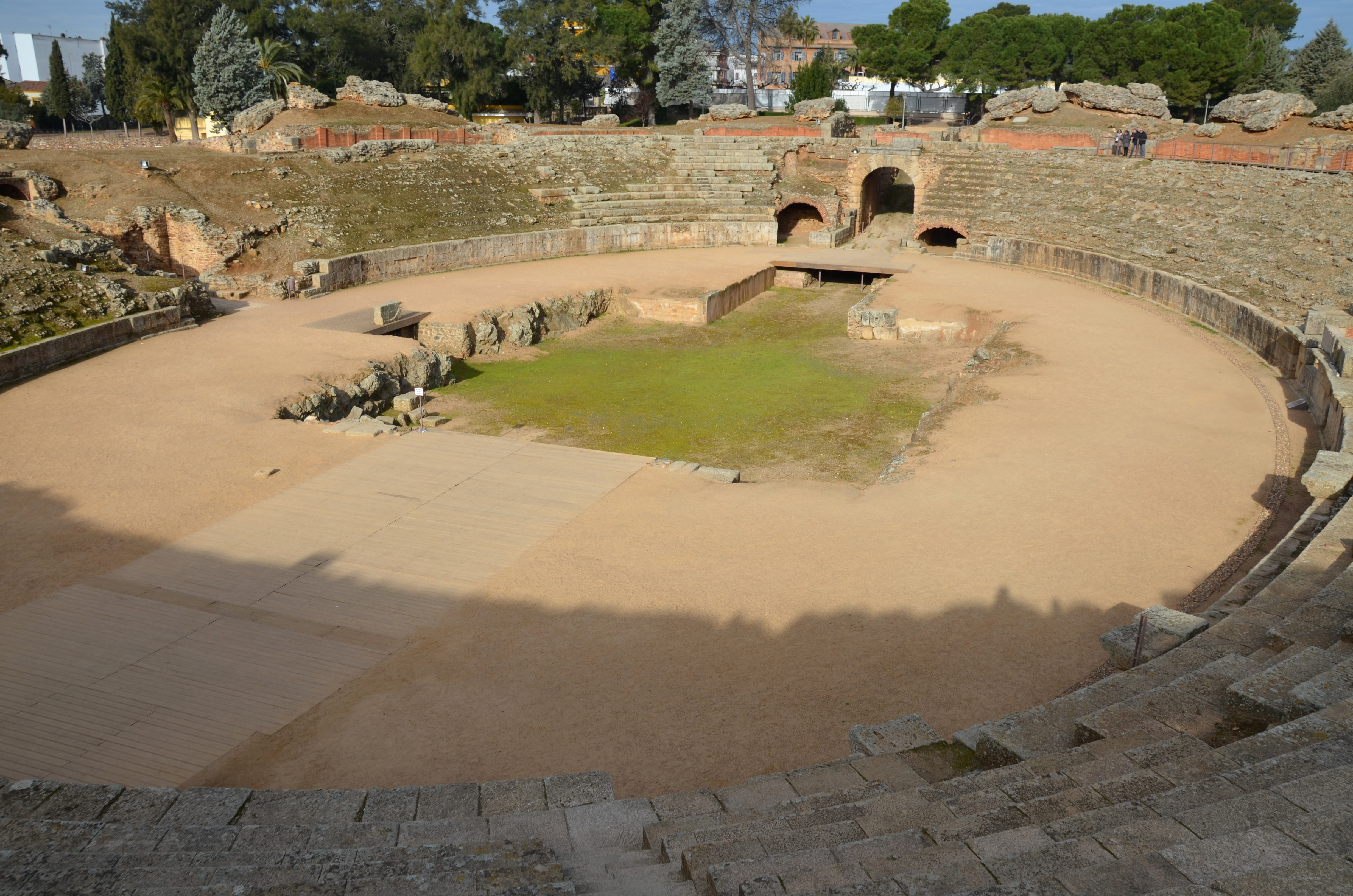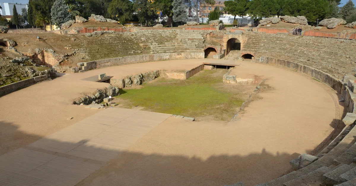 The amphitheatre of Augusta Emerita (modern-day Mérida, Spain) was construced in 8 BCE for use in gladiatorial contests and staged beast-hunts. It had a capacity of up to 15,000 people. The elliptical building was of considerable dimentions and measured 126 by 103 metres (413 by 337 feet). The sand-covered arena contained a cruciform fossa bestiaria where animals were kept before entering the arena.