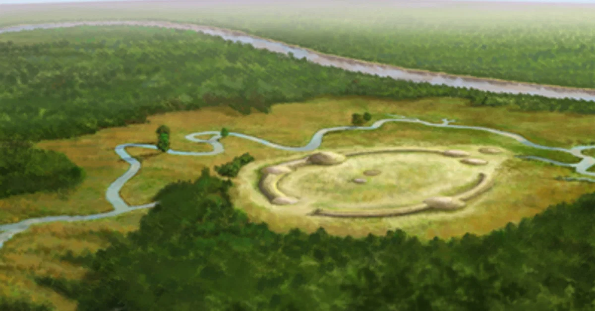 Artist's conception of the prehistoric Native American site of Watson Brake, Louisiana, dated to c. 3500 BCE.