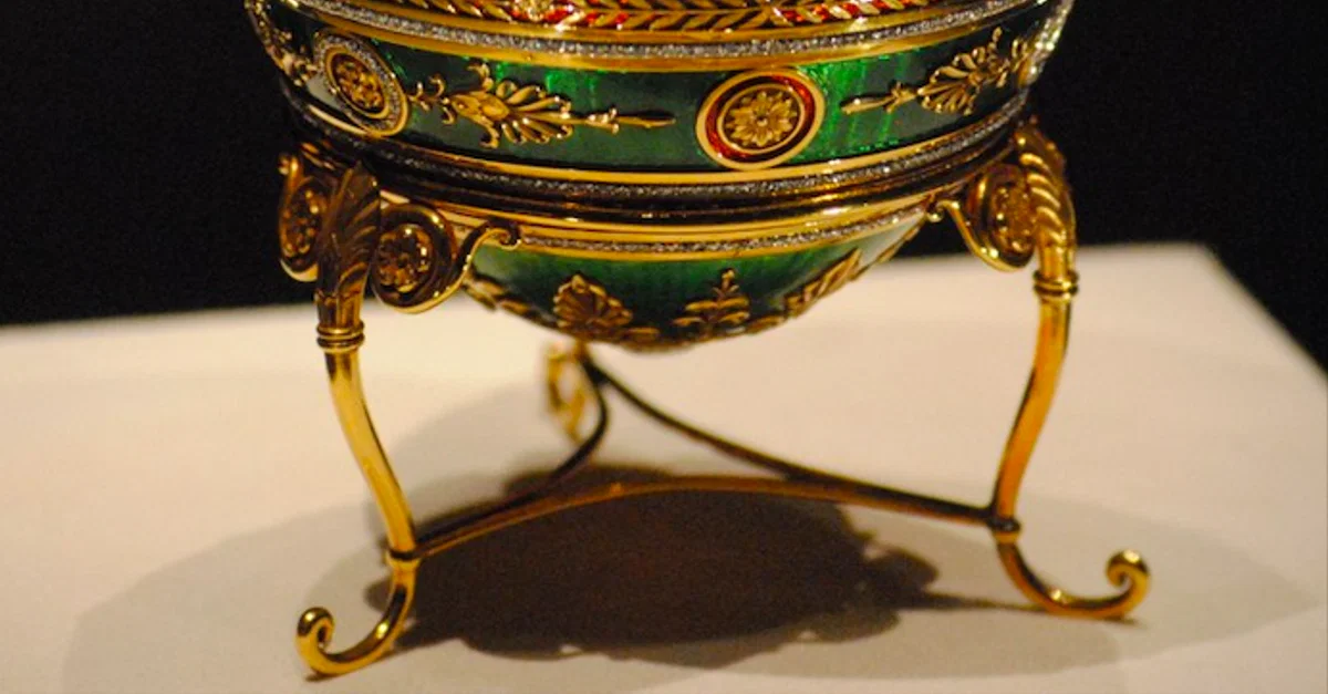 The 1912 Imperial Napoleonic Egg by Peter Carl Fabergé (1846-1920). The egg was given by Tsar Nicholas II (r. 1894-1917) to his mother the Dowager Empress Marie Feodorovna. It commemorated the 100th anniversary of the Russian wars against Napoleon. The egg is made of gold with green and red enamel and the exterior is set with rose diamonds. Inside the egg is a screen of six connected miniature paintings by Zuiev. The pictures show members of the regiments of which the Dowager Empress was the honorary colonel. It measures 12.6 cm (5 in) in length.
