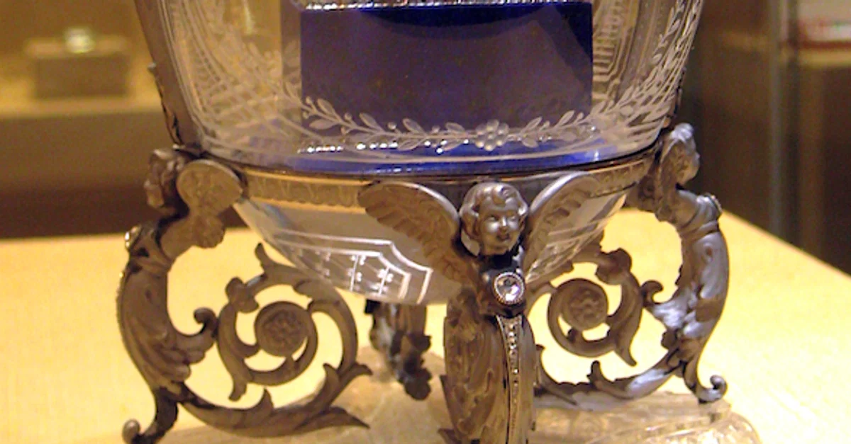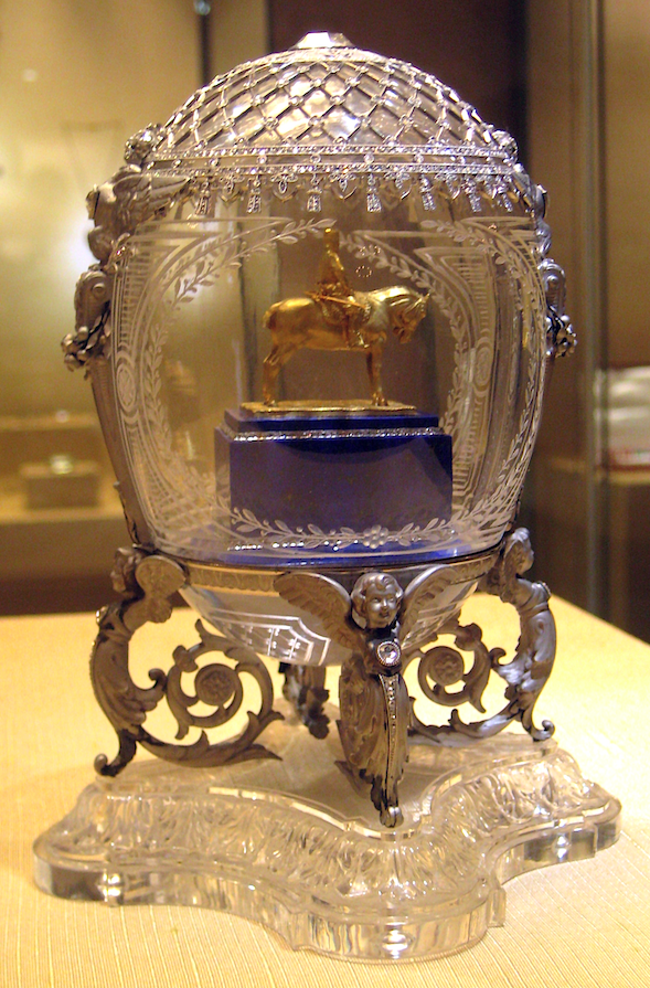 The 1910 Alexander III Equestrian Egg by Peter Carl Fabergé (1846-1920). The egg was given by Tsar Nicholas II (r. 1894-1917) to his mother the Dowager Empress Marie Feodorovna. It commemorates the unveiling of a statue of Tsar Alexander III (r. 1881-1894) in St. Petersburg in 1910. The egg is made of rock crystal with platinum mounts and decorated with rose diamonds. The gold equestrian figure is Tsar Alexander III, and it stands on a lapis-lazuli pedestal. It measures 13.5 cm (5.3 in) in height.