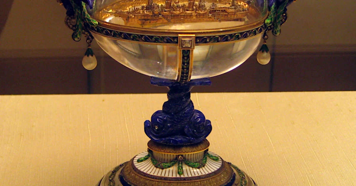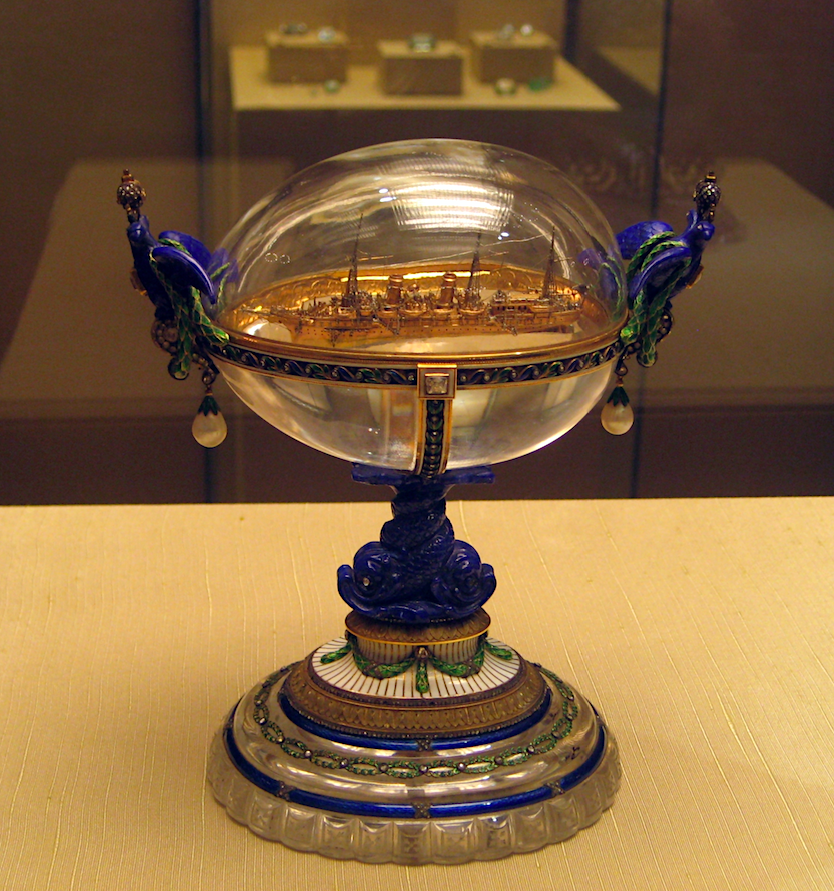 The 1909 Standart Egg by Peter Carl Fabergé (1846-1920). The egg was given by Tsar Nicholas II (r. 1894-1917) to his wife Alexandra Feodorovna. The egg is made of rock crystal with a gold mount. The foot of the egg is formed from two dolphins in lapis lazuli and the handles, rendered in the same material, represent double-headed eagles. A pearl hangs from each handle. Inside the egg, resting on a block of aquamarine, is a gold miniature model of the imperial yacht Standart. It measures 13.7 cm (5.4 in) in height.
