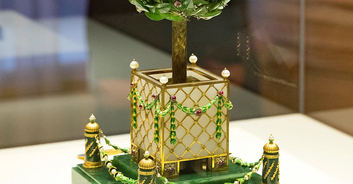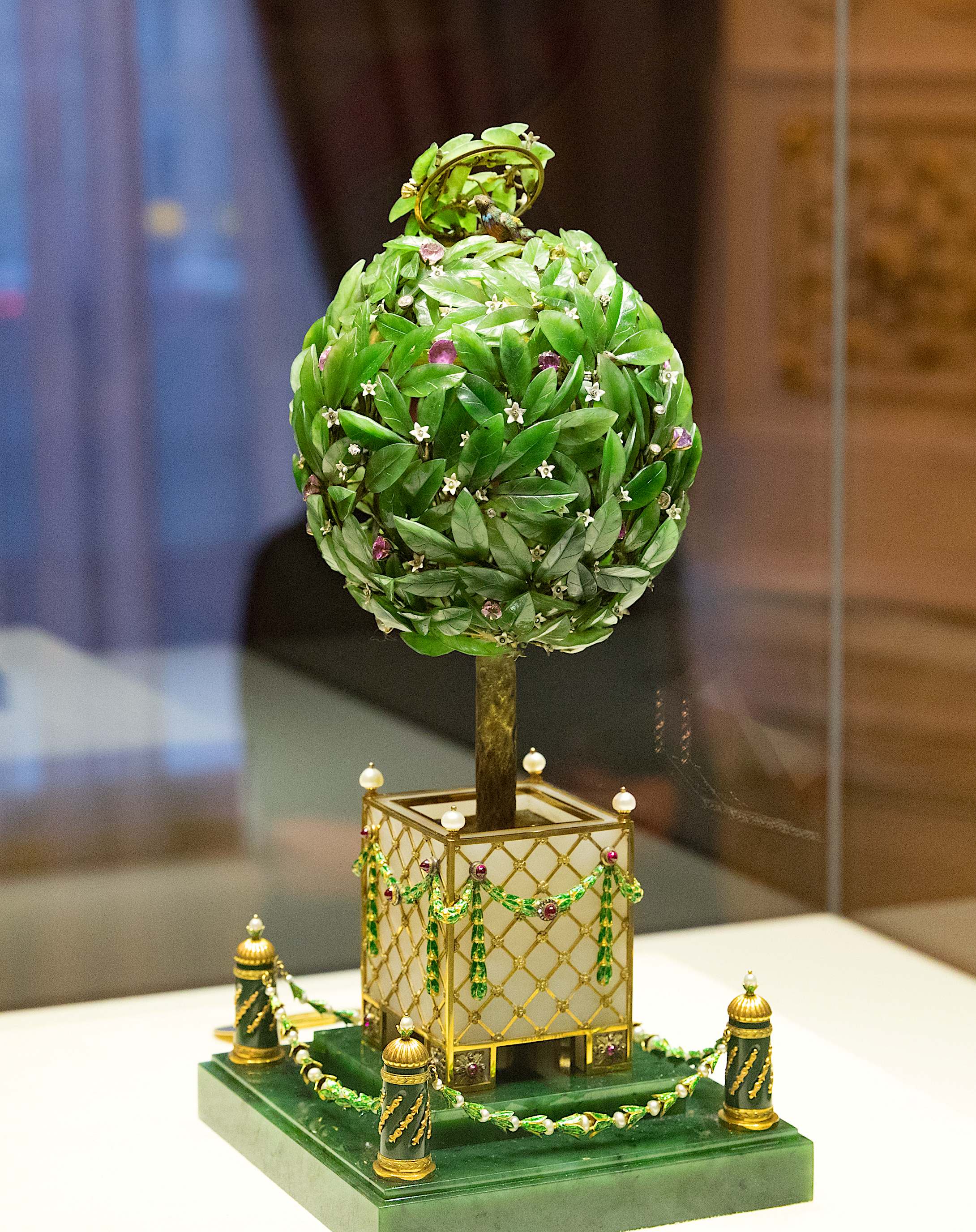 The 1911 Orange Tree Egg by Peter Carl Fabergé (1846-1920). The egg was given by Tsar Nicholas II (r. 1894-1917) to his mother the Dowager Empress Marie Feodorovna. The egg is made of nephrite, white quartz, gold, and enamel. It is set with diamonds, pearls, and rubies. Inside the tree is a singing automaton bird, which is operated by pushing on a jewelled fruit - the bird then emerges through a hinged opening in the top leaves. The egg measures 26.7 cm (10.5 in) in height.