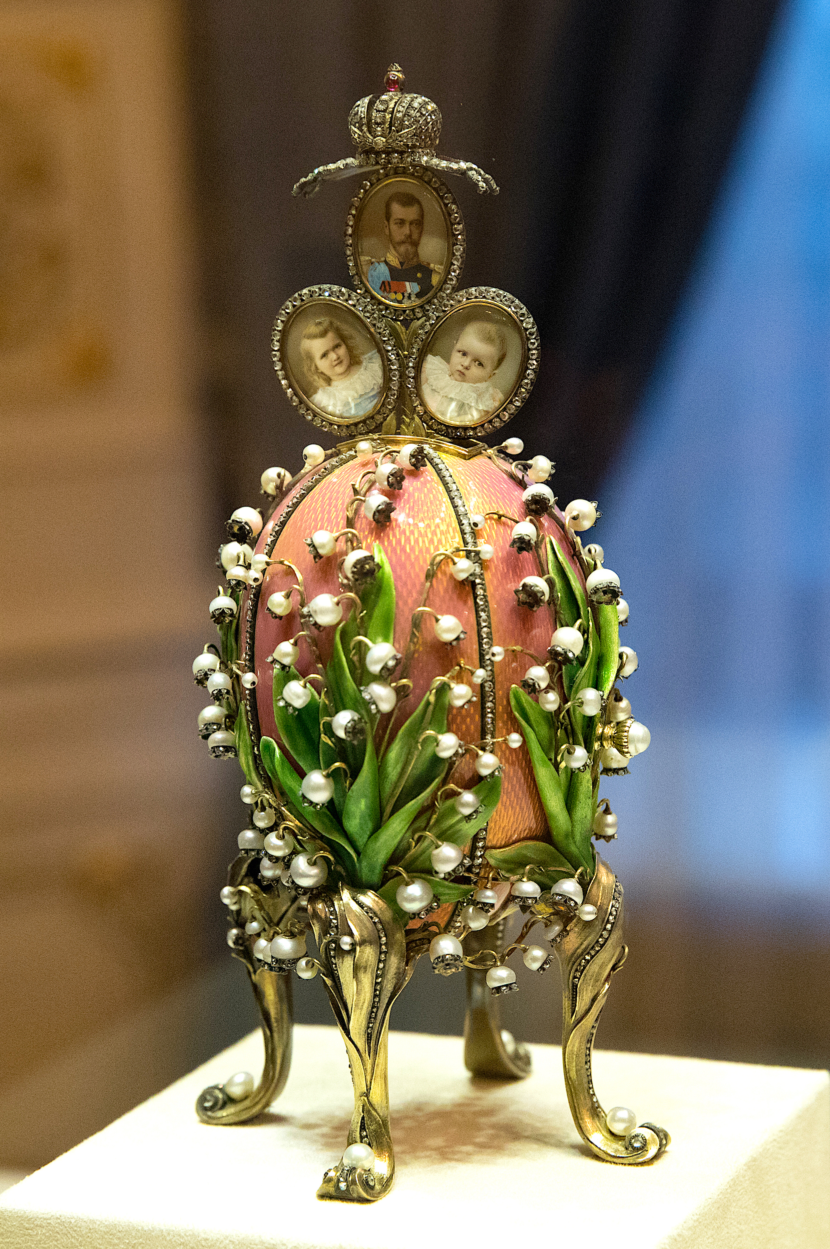 The 1898 Lilies of the Valley Egg by Peter Carl Fabergé (1846-1920). The egg was given by Tsar Nicholas II (r. 1894-1917) to his wife Alexandra Feodorovna. The egg is made of gold and pink enamel with pearl, diamond, and ruby decoration. The surprise is a trio of portraits which appear through the top of the egg. The portraits are of Tsar Nicholas and his two daughters. It measures 15 cm (5.9 in) in height.