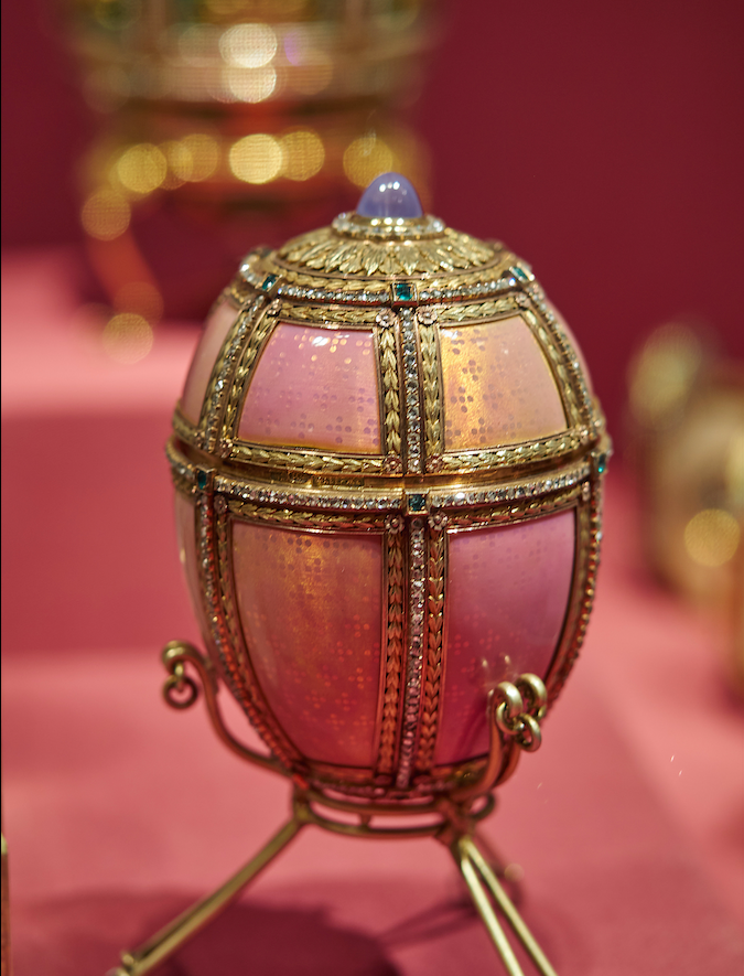 The 1890 Danish Palaces Egg by Peter Carl Fabergé (1846-1920). The egg was given by Tsar Alexander III (r. 1881-1894) to his wife Marie Feodorovna. The egg is made of gold and pale rose enamel. The top of the egg has a star sapphire and additional decoration is given with emeralds and diamonds. The surprise inside the egg is a series of ten connected miniature paintings with gold frames. The paintings by Konstantin Krijitski show residences in Denmark and Russia which were favourites of the empress. The egg measures 10.2 cm (4 in) in height.