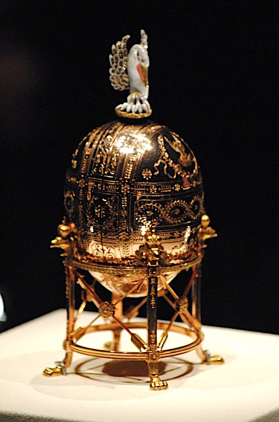 The 1898 Imperial Pelican Egg by Peter Carl Fabergé (1846-1920). The egg was given by Tsar Nicholas II (r. 1894-1917) to his mother the Dowager Empress Marie Feodorovna. It commemorates the 100th anniversary of the charitable institutions the dowager supported. The egg is made of engraved red gold with extra decoration rendered using diamonds and pearls. The top of the egg is decorated with an enamel pelican, a traditional symbol of maternal care. The surprise inside, which is attached to the pelican, has eight interconnected oval miniature paintings by the Danish artist Johannes Zehngraf. The paintings show some of the charitable institutions the dowager supported. The egg measures 10.2 cm (4 in) in height.