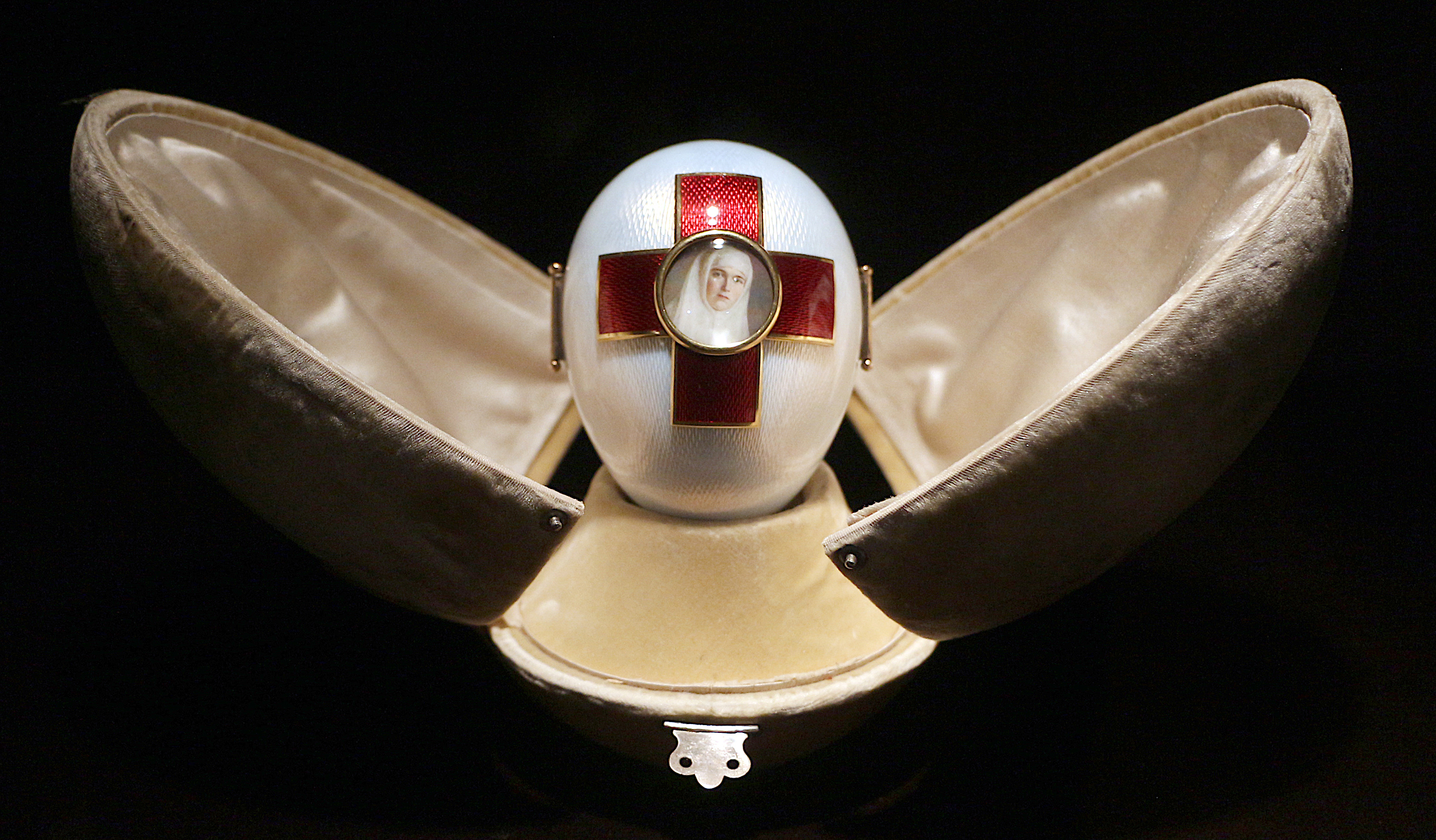 The 1915 Red Cross with Triptych Egg by Peter Carl Fabergé (1846-1920). The egg was given by Tsar Nicholas II (r. 1894-1917) to his wife Alexandra Feodorovna. The egg commemorates the founding of the Russian Red Cross by the empress. It is made of gold with white and red enamel. The portraits represent two of the tsar's daughters - Olga and Tatiana - who served in the Red Cross during WWI. The surprise inside the egg shows Jesus Christ's resurrection with two saints, the patron saint of each daughter. The egg is notably less ostentatious than earlier eggs and perhaps reflects the more sombre times of the period. It measures 86 cm (3.4 in) in height.