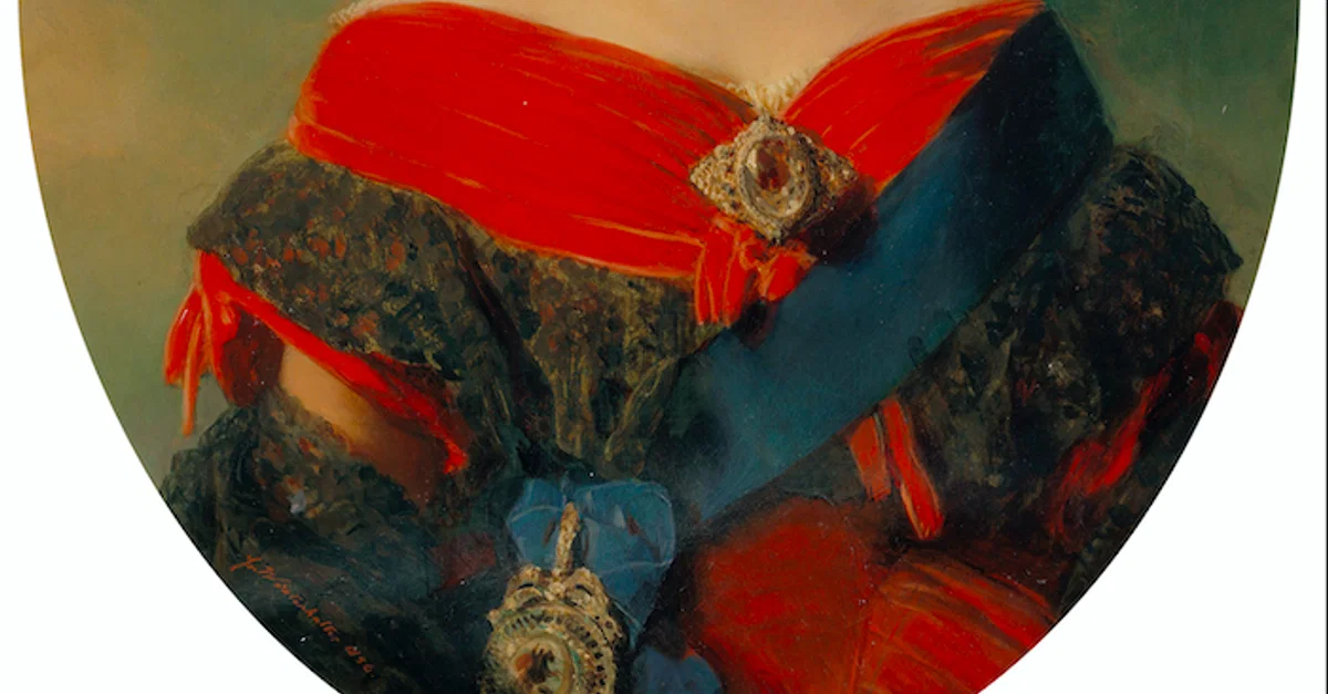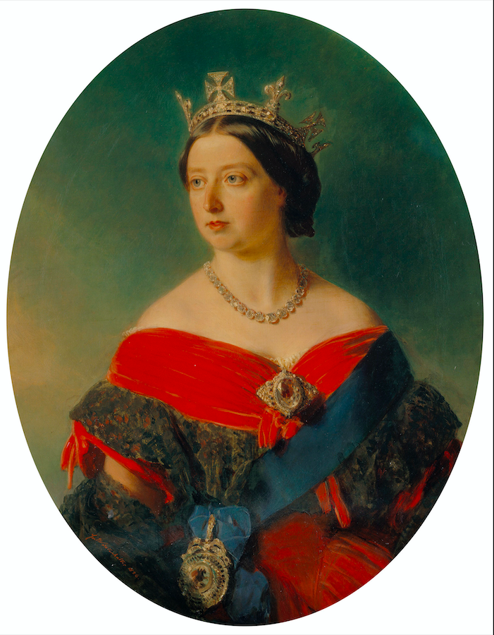 An 1856 painting by Franz Xaver Winterhalter of Queen Victoria (r. 1837-1901). The queen is wearing a pendant with the Koh-i-Noor diamond. The Koh-i-Noor is a 105.6 carat, oval-cut brilliant. Mined in India, the stone is now part of the British Crown Jewels and kept in the Tower of London.