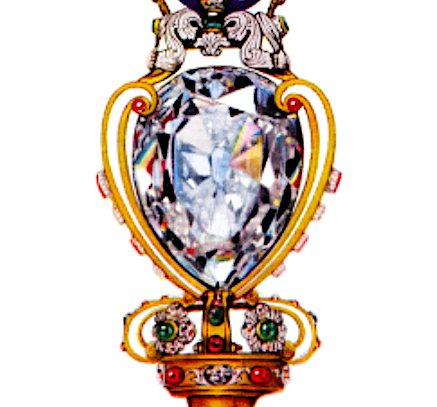 The Cullinan I diamond, added to the Sovereign Sceptre of the British Crown Jewels in 1911. The diamond weighs 530 carats and is also known as the Star of Africa. The British Crown Jewels are kept in the Tower of London. (Detail from an image from G. Younghusband & C. Davenport, 'The Crown Jewels of England', London: Cassell & Co, 1919 CE)