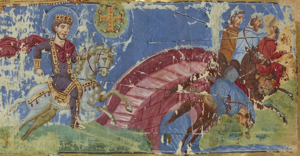 Constantine I's (r. 306-337 CE) vision and the Battle of the Milvian Bridge in a 9th-century Byzantine manuscript. Detail from folio 440 recto of manuscript BnF MS Gr510, dated 879-883 and containing the homilies of Gregory of Nazianzus.
