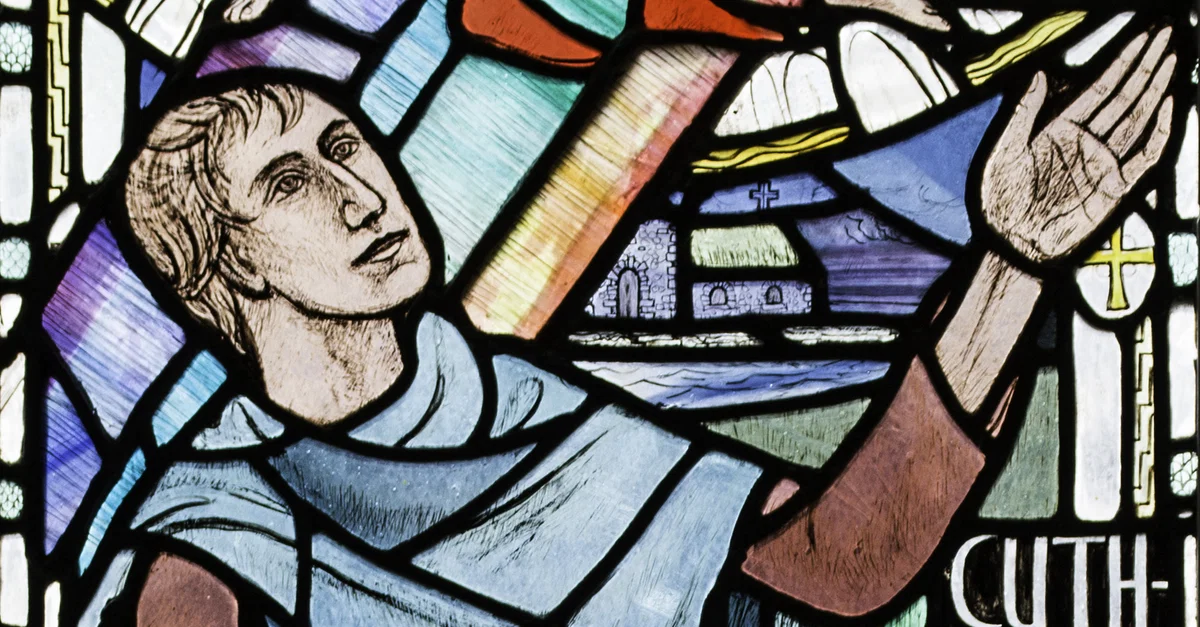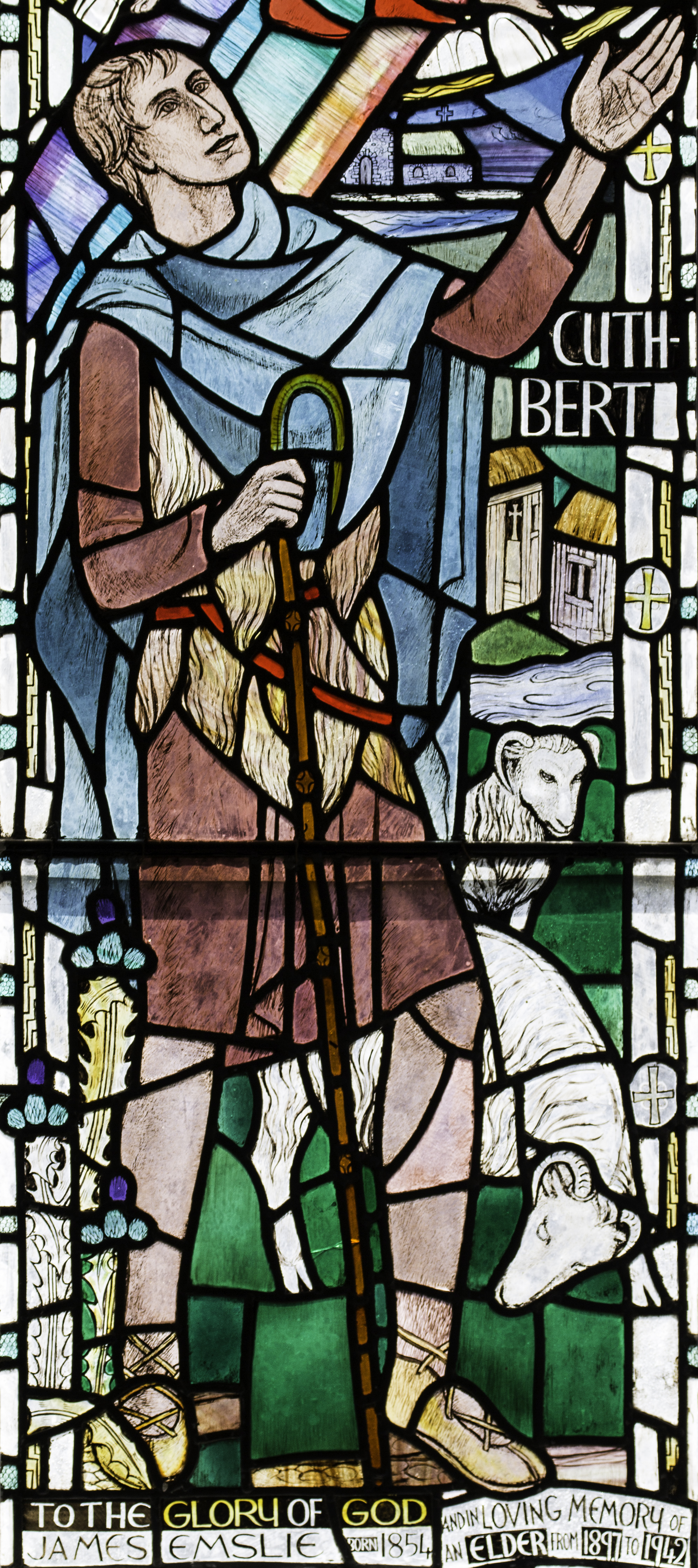 Stained glass window of Saint Cuthbert (c. 634 - 20 March 687) in St. Cuthbert's Church, Edinburgh.