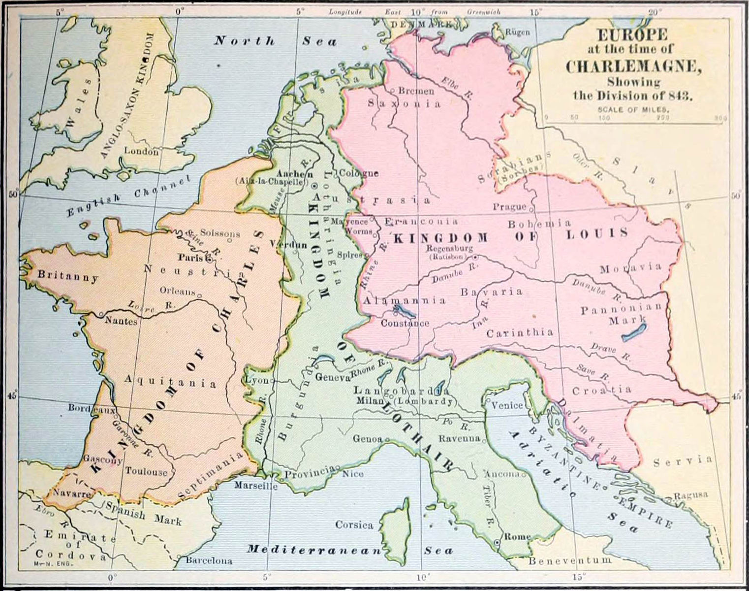 Map of the Carolingian Empire following its division in 843 by the Treaty of Verdun. At the death of Emperor Louis the Pious (r. 813-840), the Kingdom of the Franks was partitioned and allocated to three of his four sons. West Francia (orange) was given to Charles the Bald (r. 843-877), East Francia (pink) to Louis the German (r. 843-876), and Middle Francia (green) to Lothar I (r. 840-855), who also inherited the imperial title.