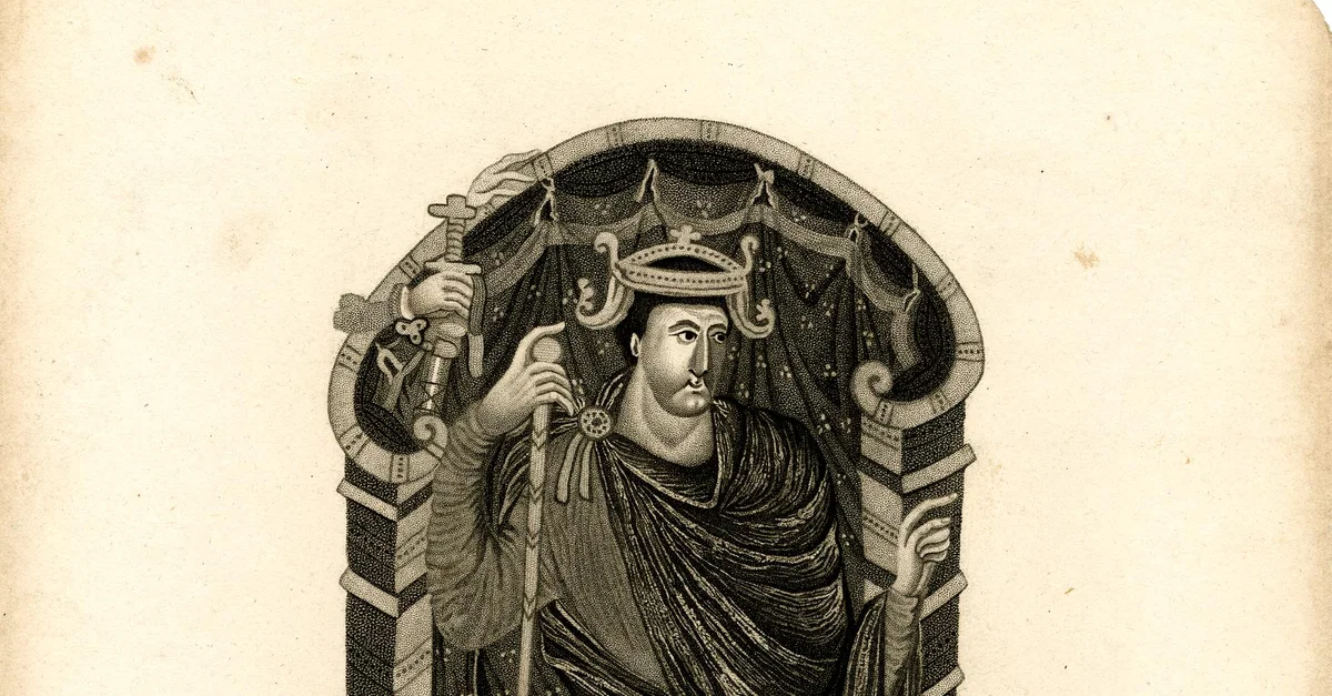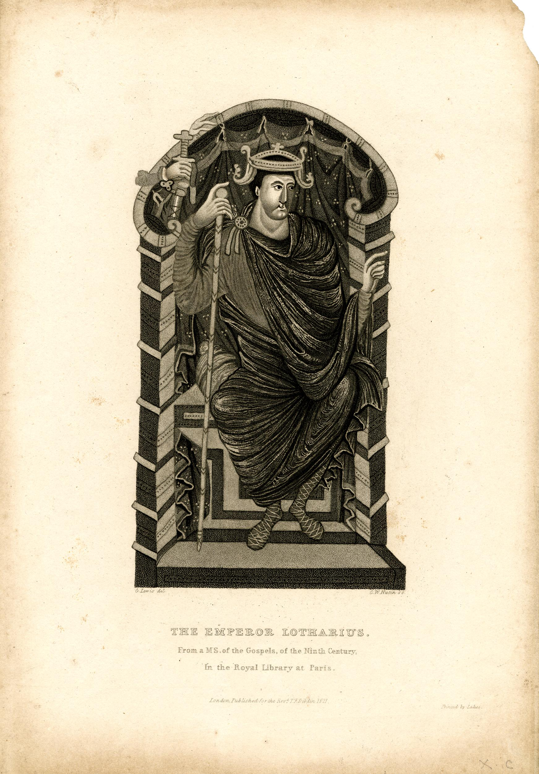 Illustration of an enthroned Lothar I, Holy Roman Emperor (r. 840-855), King of Middle Francia (Lotharingia) and Italy (r. 843-855). Copied by G.W. Hutin, 1821, from a 9th-century manuscript of the Gospels.