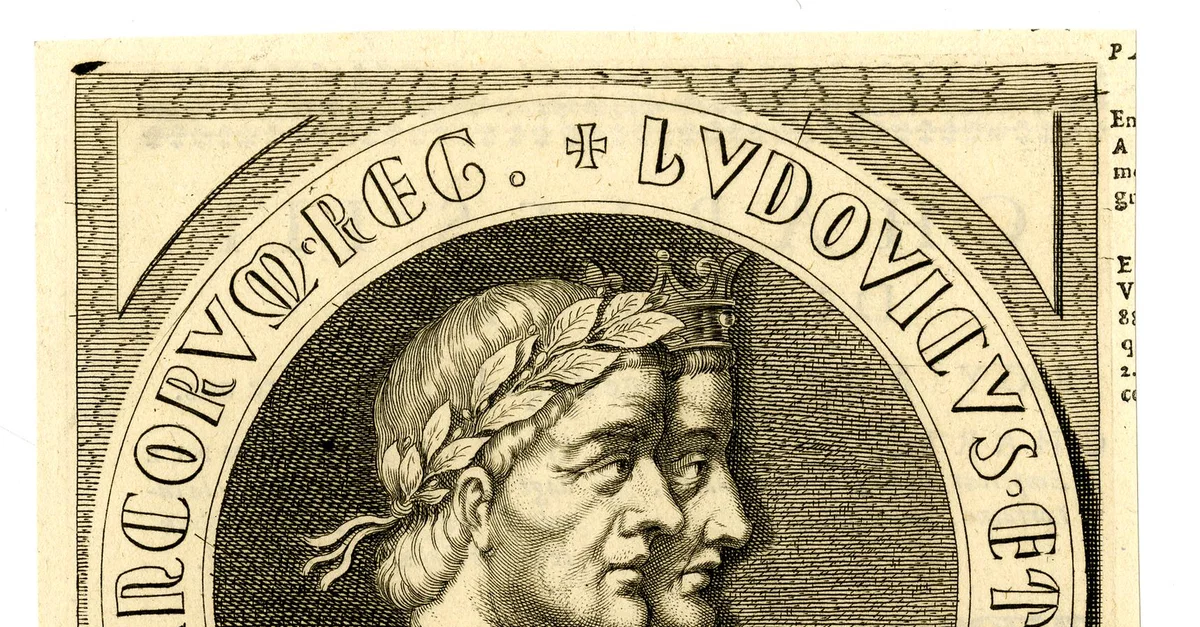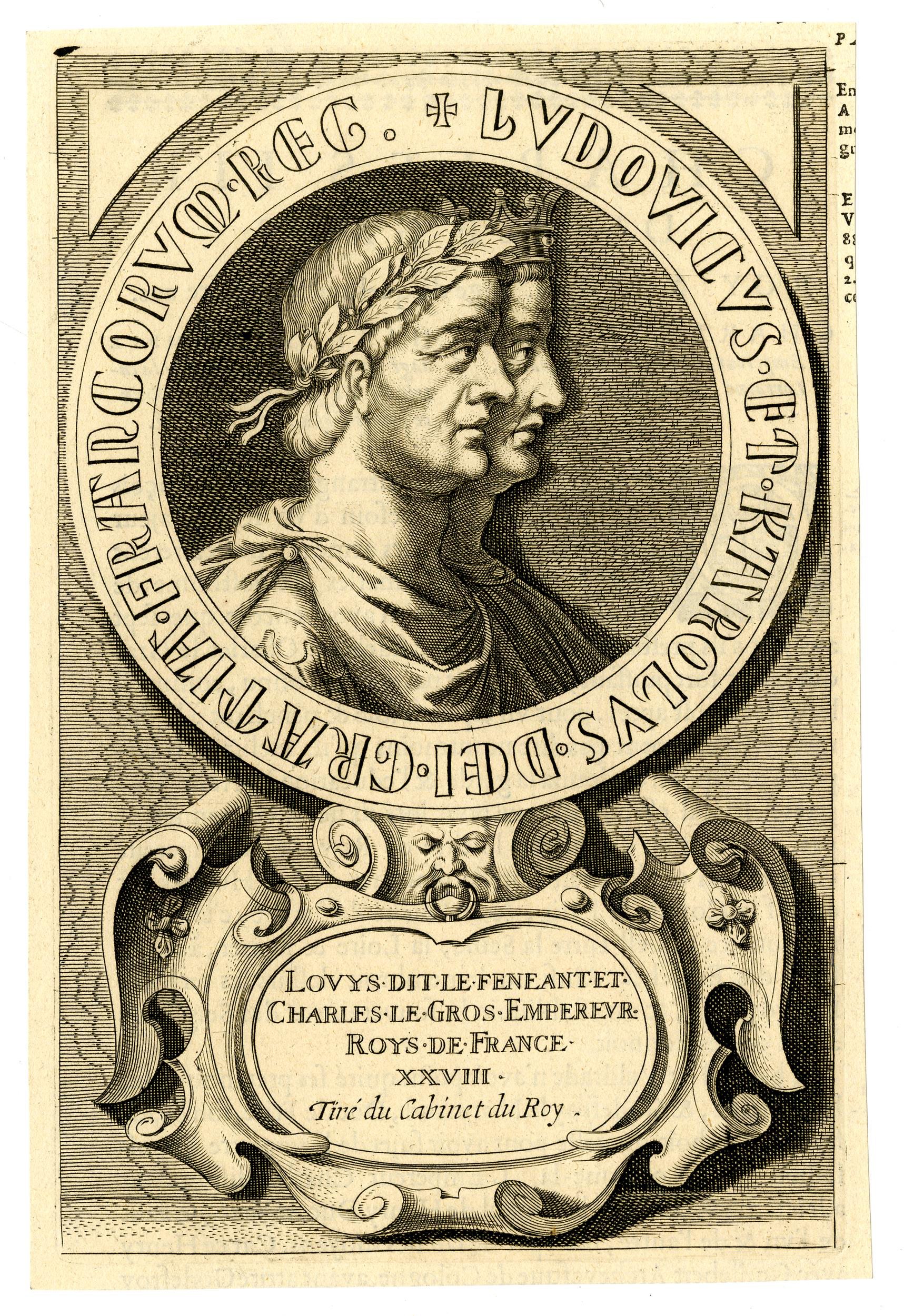 Engraved portrait of Kings of East Francia Charles the Fat (r. 876-887 CE), Holy Roman Emperor (r. 881-887 CE), and Louis III the Younger (r. 876-882 CE), by unknown creator, c. 1634-1643 CE.
