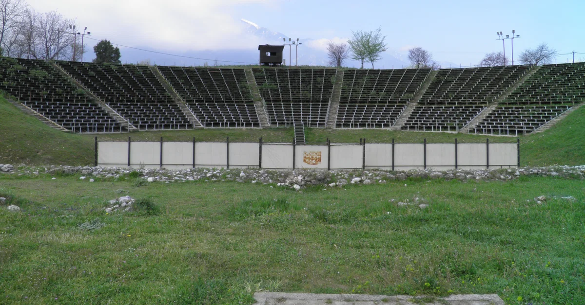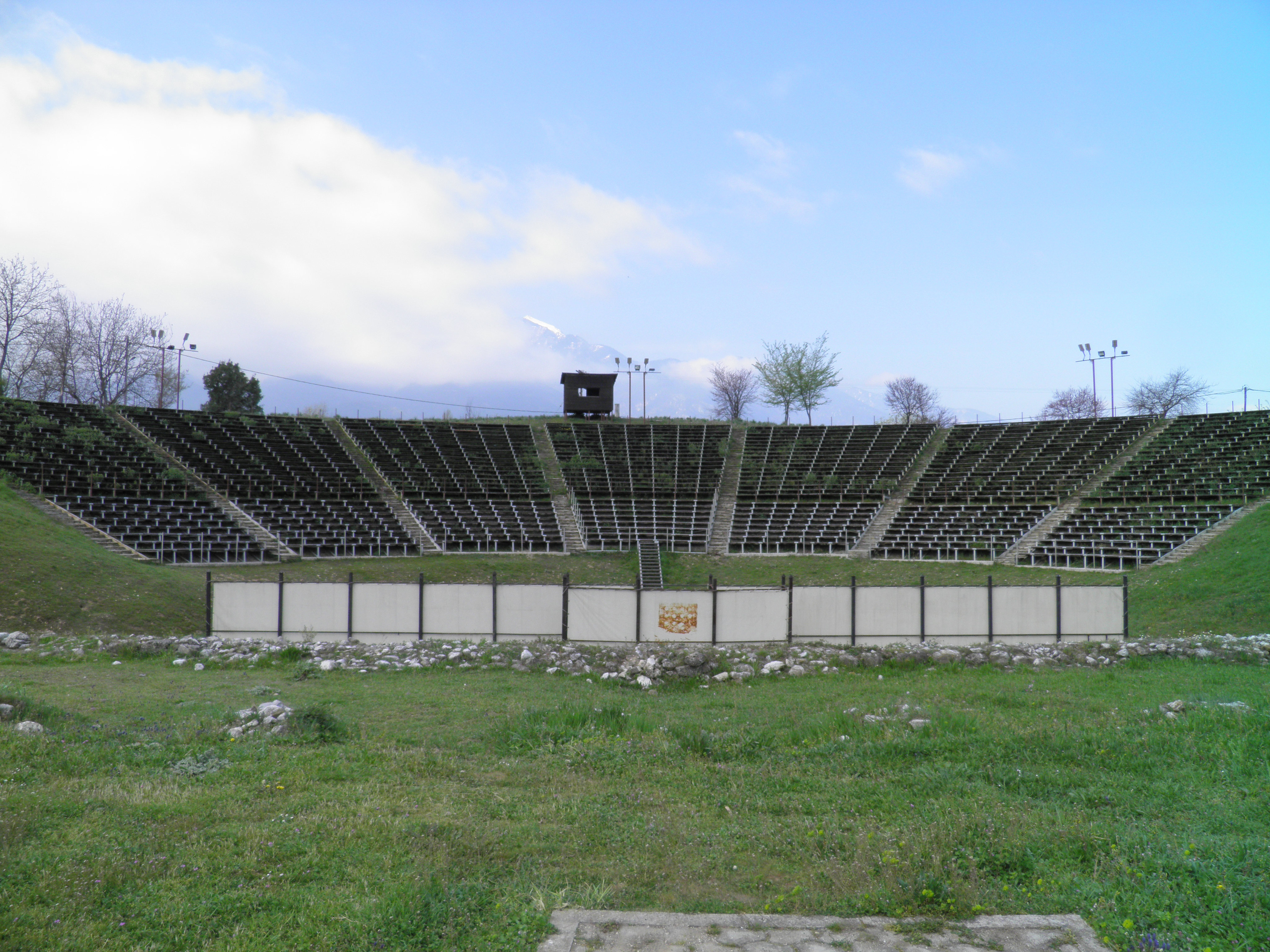 The Hellenistic Theatre at Dion in Macedon with Mount Olympus in the background. The theatre was built into a natural hill during the 3rd century BCE. It underwent several phases of modification during the reign of Philip V (r. 221-179 BCE) and the Roman period. Theatrical games were held at the theatre, including the nine-day festival in honour of the Nine Pierian Muses.