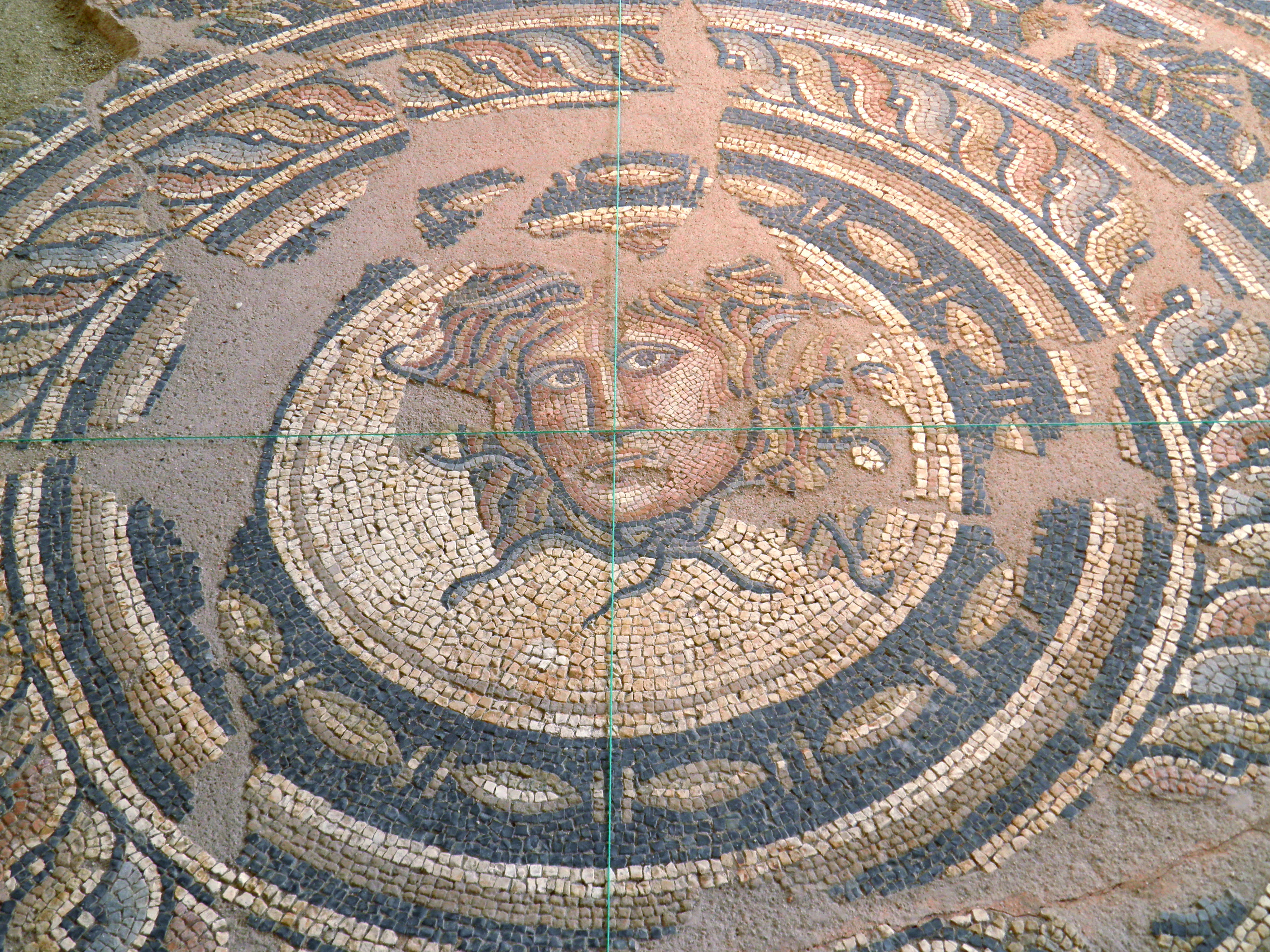 Mosaic floor from the Villa of Dionysus in Dion (Greece) depicting Medusa's head in a circular frame. 2nd century CE. Archaeological Museum, Dion.