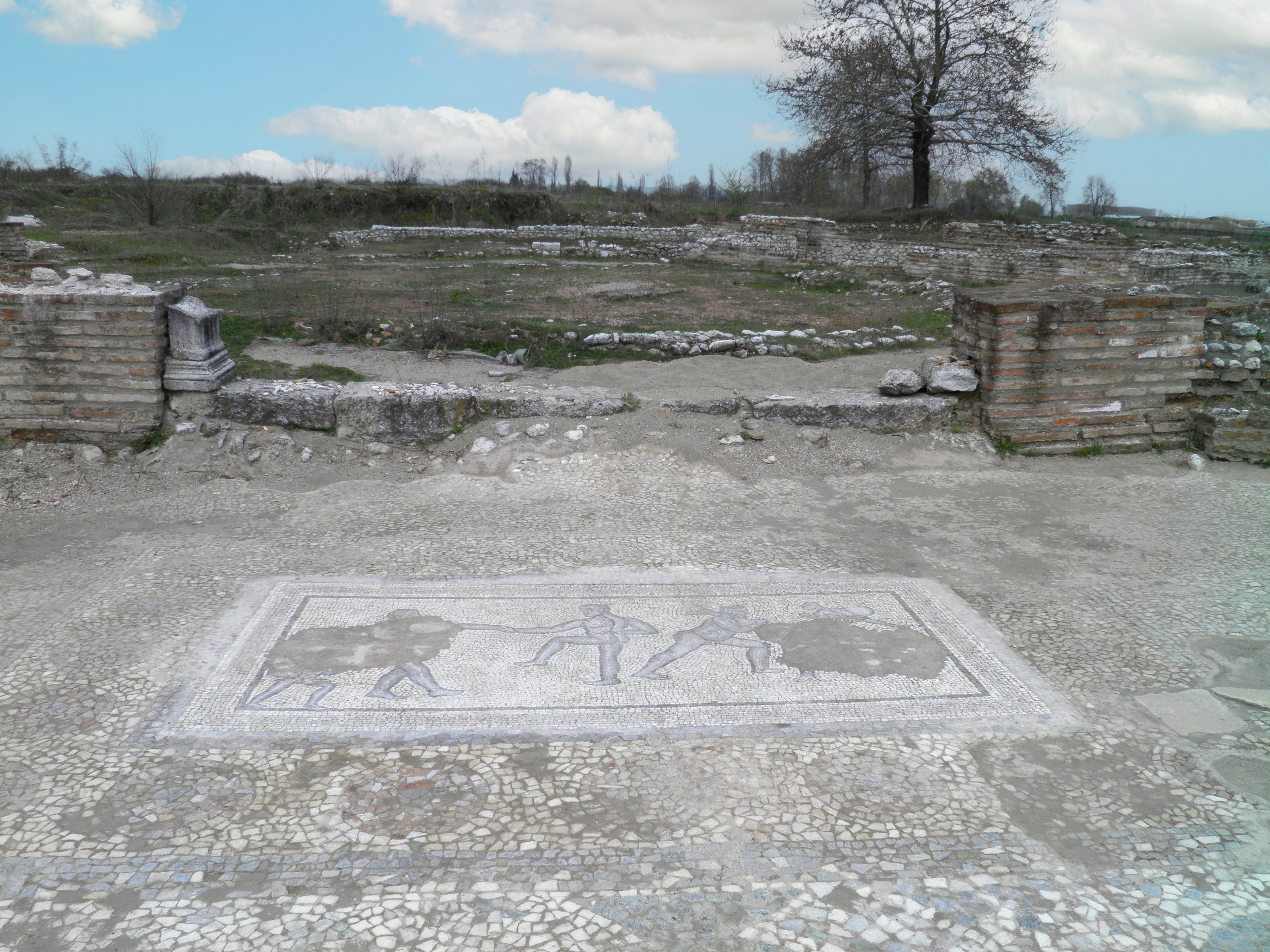 The Polygonal Building in Dion (Greece), located at the intersection of the main cardo and the decumanus (east-west road), is thought to have been a palaestra due to a mosaic depicting wrestlers that was found in one of the rooms.
