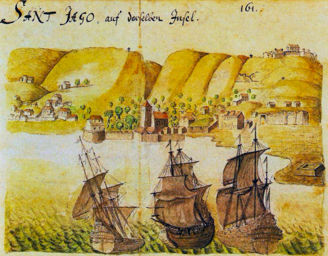 A c. 1646 watercolour painting showing the town of Ribeira Grande on Santiago, one of the islands of the Cape Verde archipelago, then a Portuguese colony. Painting by Caspar Schmalkalden, image by Arquipelagos. (Forschungsbibliothek Gotha)