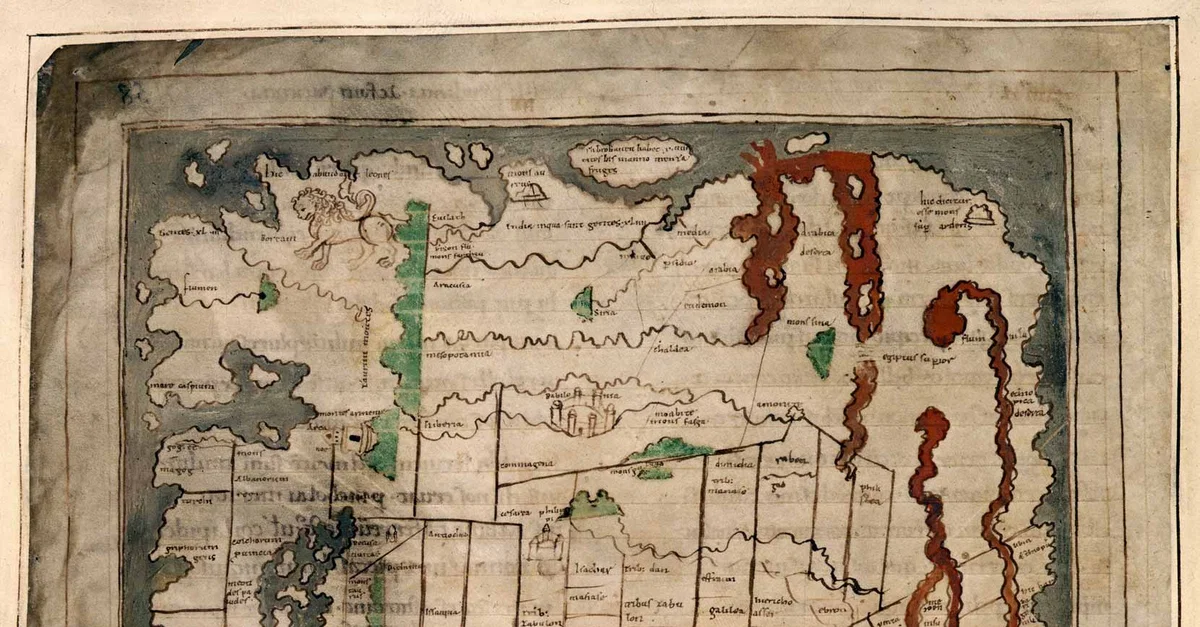The "Cotton Map" is an Anglo-Saxon map of the world produced during the 12th Century. The map is oriented with East at the top, and West at the bottom, in the style of many Medieval maps. The Anglo-Saxon map is sometimes called the "Cotton Map" after Cotton MS Tiberius B.V., the manuscript in which it is drawn. (Courtesy of the British Library)