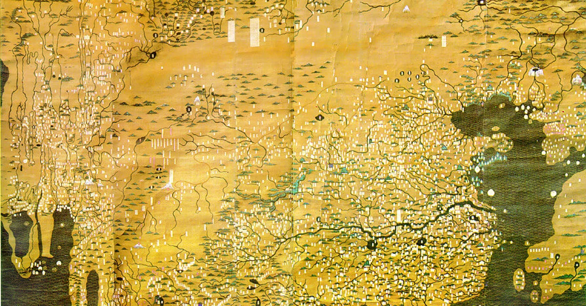 The Da Ming Hunyi Tu is a Chinese world map made c. 1389, during the Ming Dynasty. The map, which replicates the curvature of the Earth, centers on China but also includes Africa and Europe. 386 (151.9 in) x 456 cm (175.9). Paint on silk. First Historical Archive of China, Beijing.