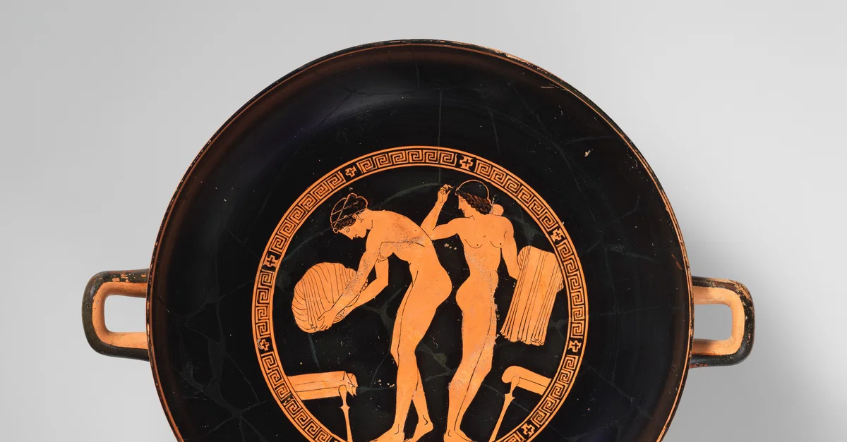 Red-figure terracotta kylix cup depicting two women setting aside their garments in preparation for bathing. Attic, made c. 470 BCE. Attributed to Douris the Painter. 31.6 cm (12.5 in) in diameter. (Metropolitan Museum of Art)