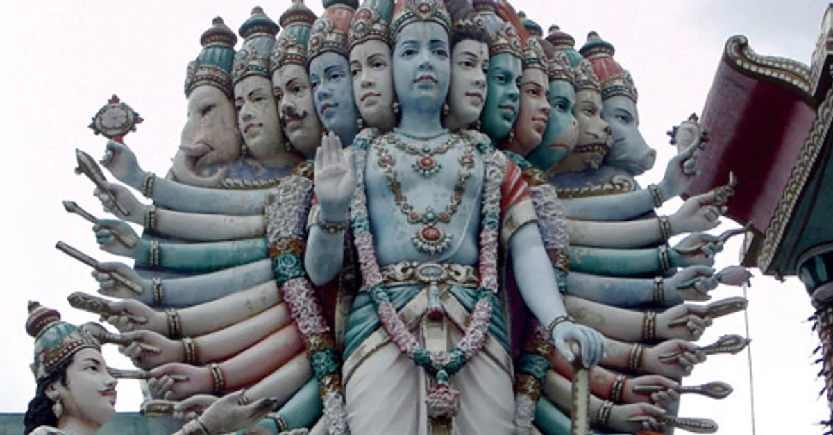 Statue at a temple in Singapore of the God Krishna manifesting his full glory to Arjuna on the battlefield of Kurukshetra.