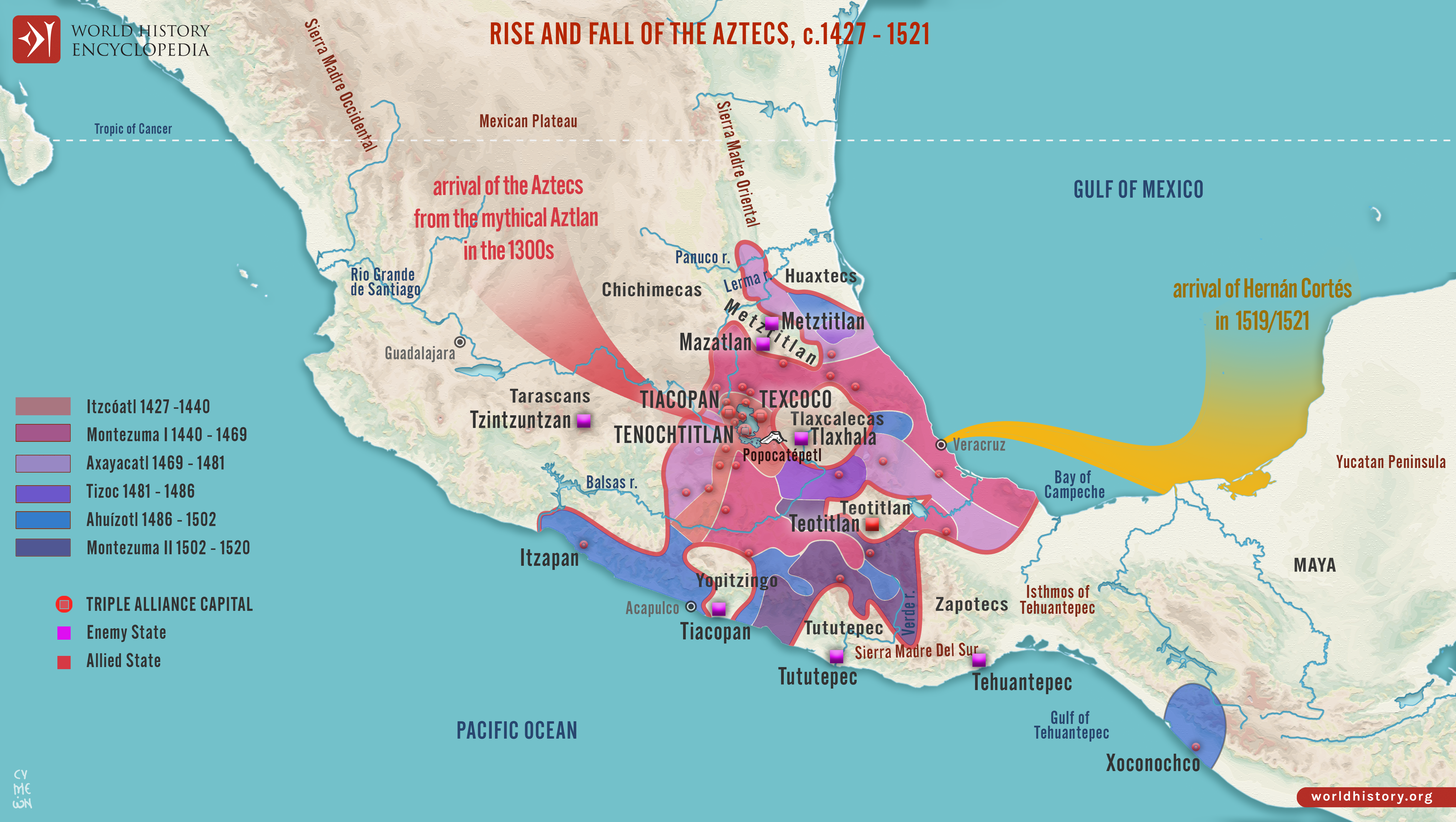Netchev, S. (2021, June 03). Map of the Aztec Empire, c. 1427–1521: The Rise and Fall of Mesoamerica’s Warrior Kings. World History Encyclopedia. https://www.worldhistory.org/image/14181/map-of-the-aztec-empire-c-1427-1521/