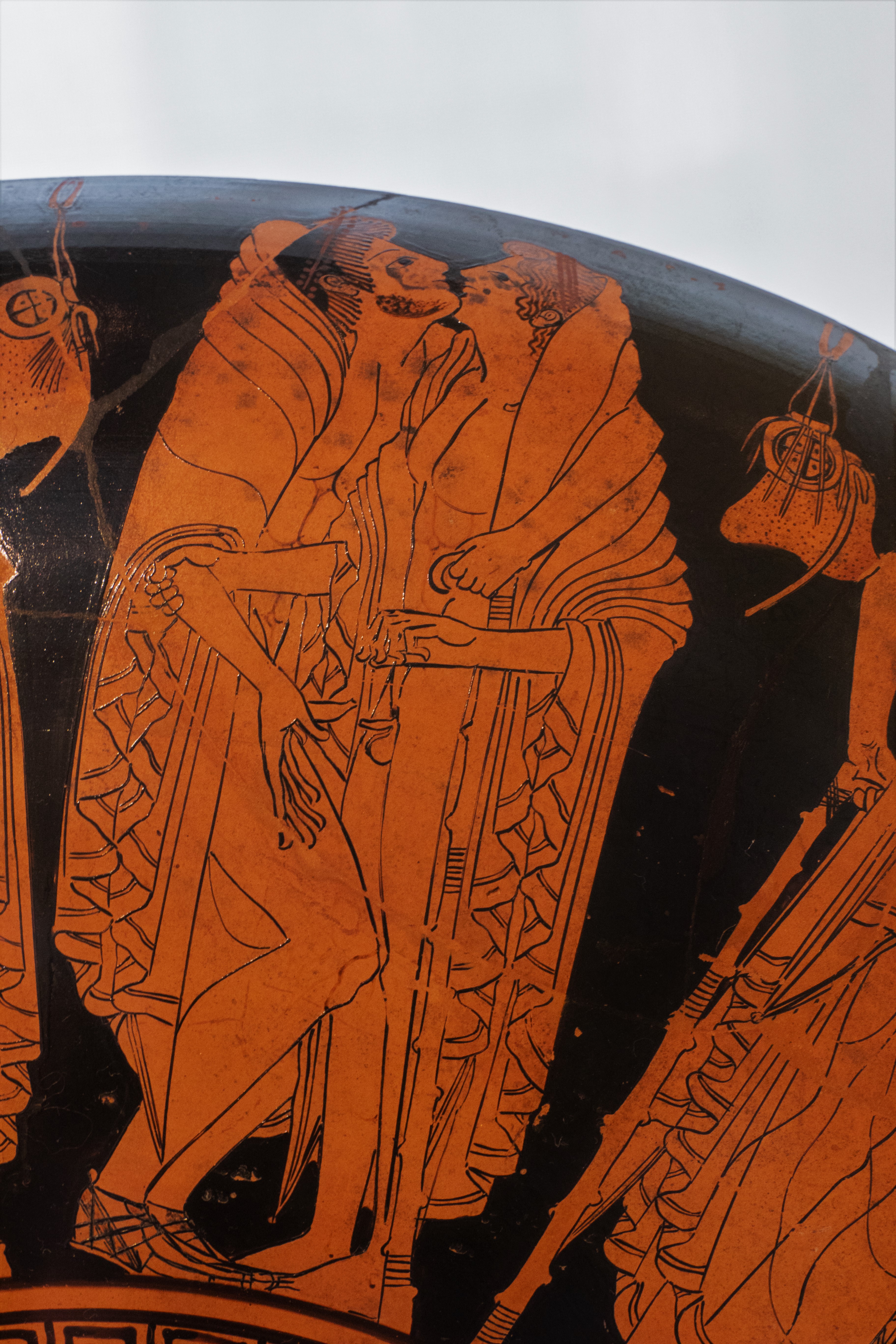 Detail of a red-figure cup by the painter Peithinos. The cup shows an array of couples, including this male couple. Made in Vulci, Italy c. 500 BCE. (Altes Museum)