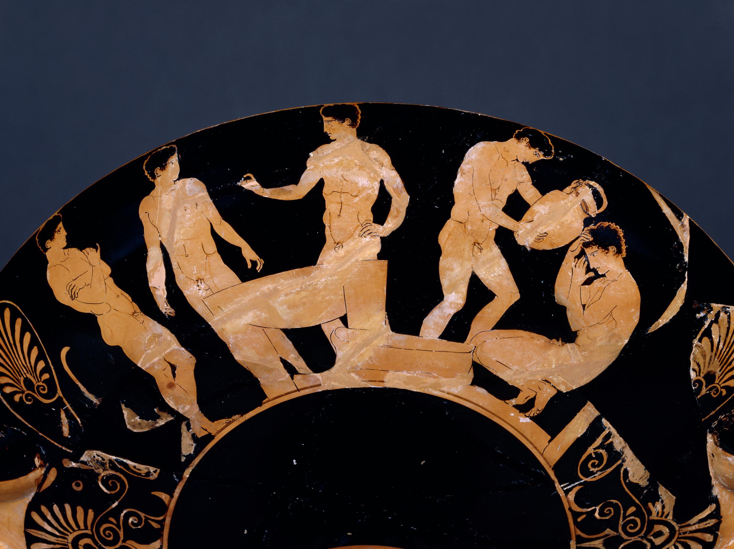 Red-figure kylix depicting youths at the baths in a homoerotic scene. Attributed to the Codris Painter, c. 430 BCE. Attica, Greece. (British Museum)