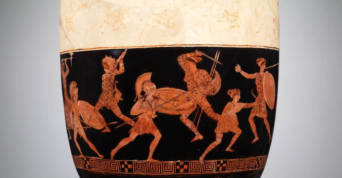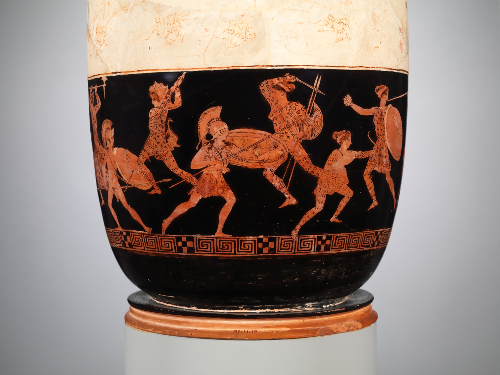 Bottom register of a red-figure lekythos. This scene depicts the Greeks, led by Theseus, engaged in combat with the Amazons led by Queen Hippolyte. Attributed to the Eretria Painter, c. 420 BCE. Attica. Metropolitan Museum of Art, New York.