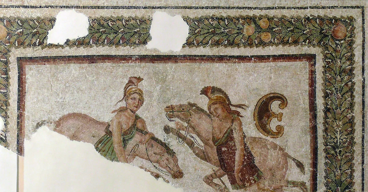 Fragment of a Roman mosaic depicting two Amazons. Early 3rd century CE, from the House of Ostriches in Sousse, Tunisia. (Archeological Museum of Sousse)