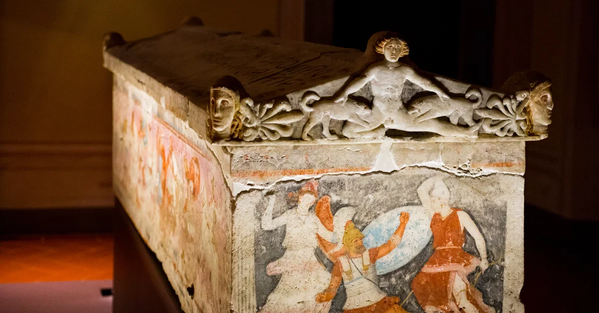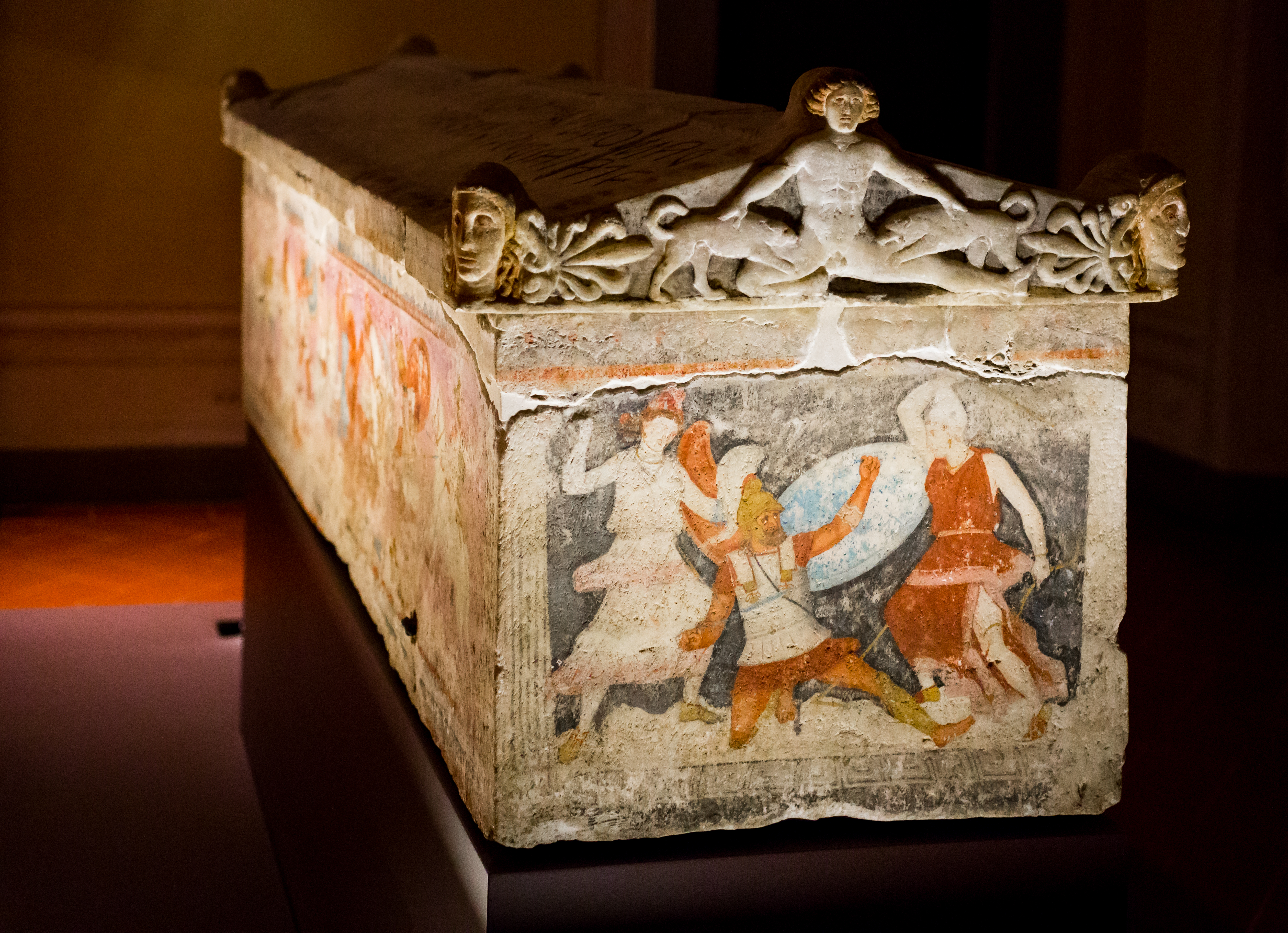 Detail of a painted alabaster sarcophagus depicting an Amazonomachy. Etruscan culture. c. 300 BCE. Tarquinia, Italy. (De Feis Etruscan Archaeological Museum)