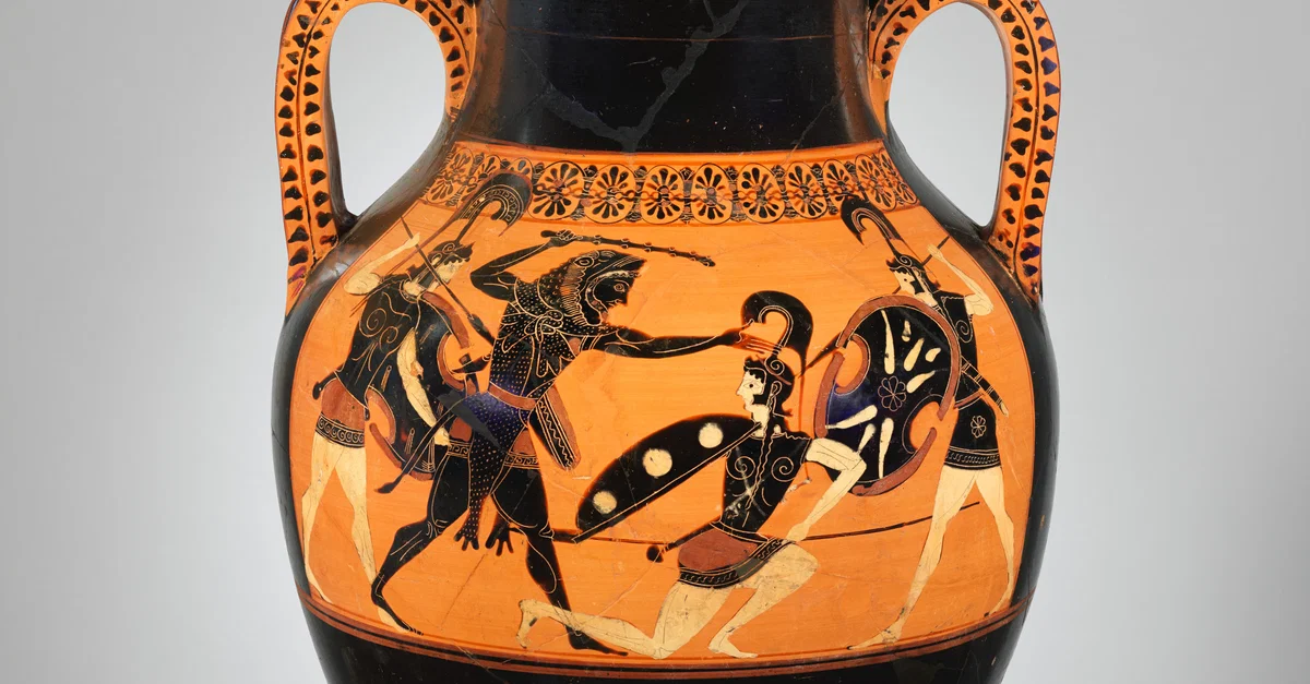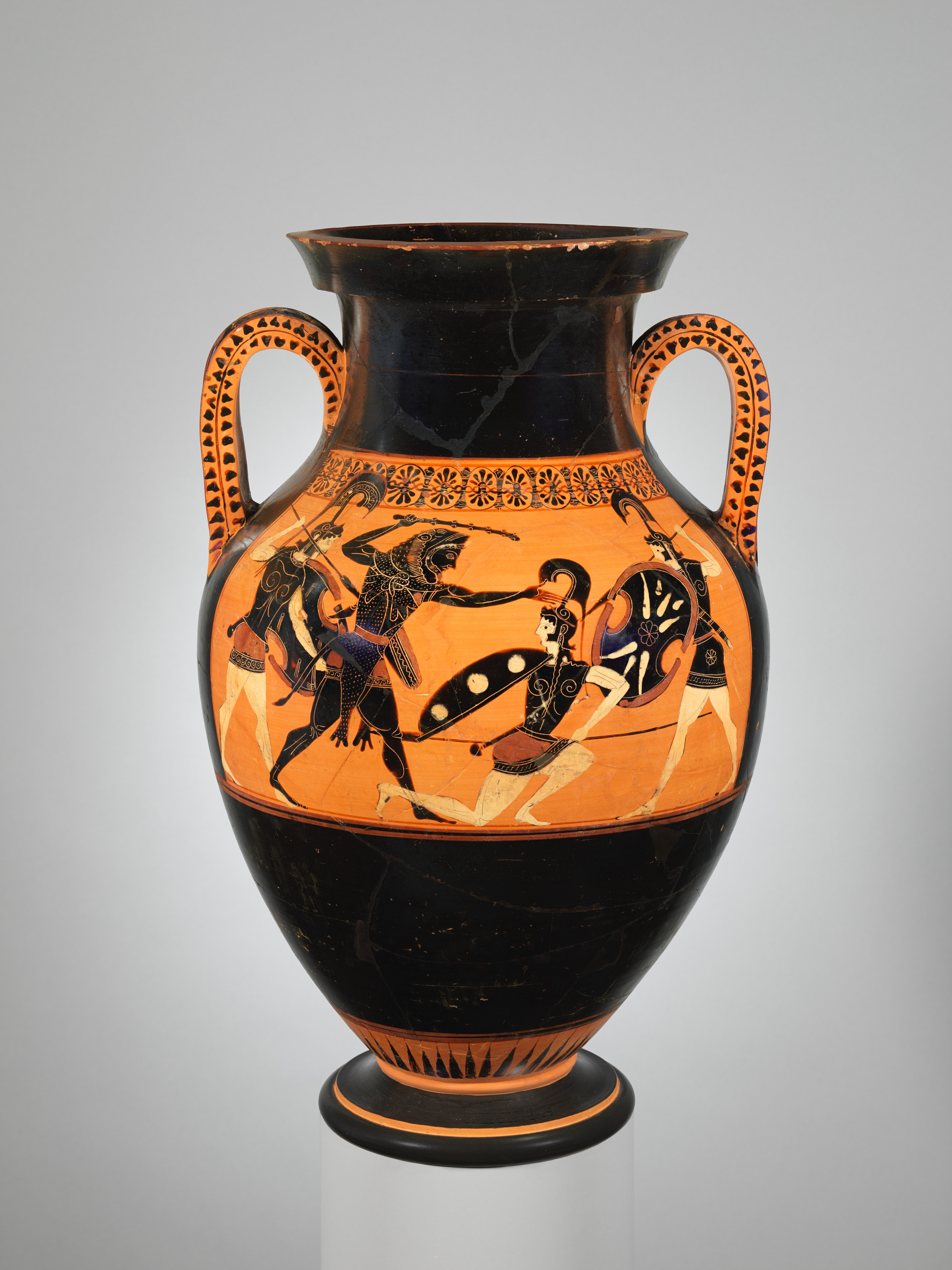 Amphora depicting Hercules fighting the Amazon queen Hippolyte. Attributed to a painter of Bateman Group, c. 530 BCE. Attica. 21.4 cm (8.5 in). Metropolitan Museum of Art.