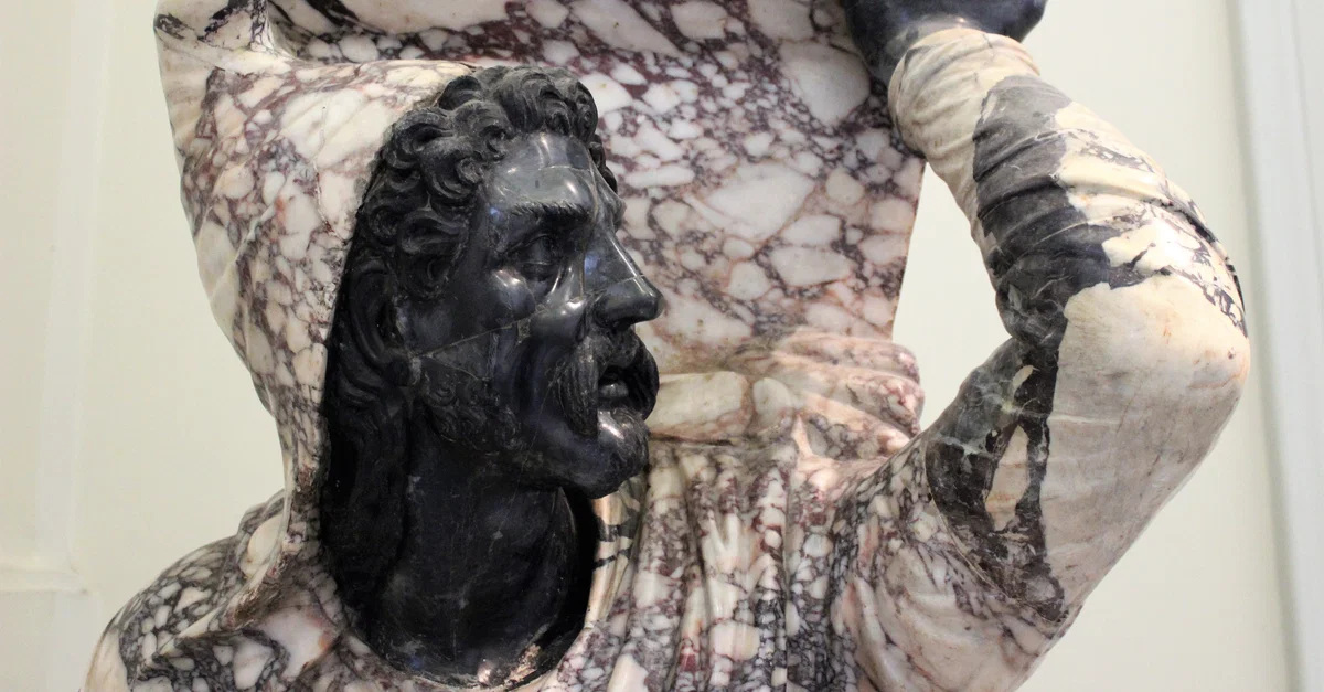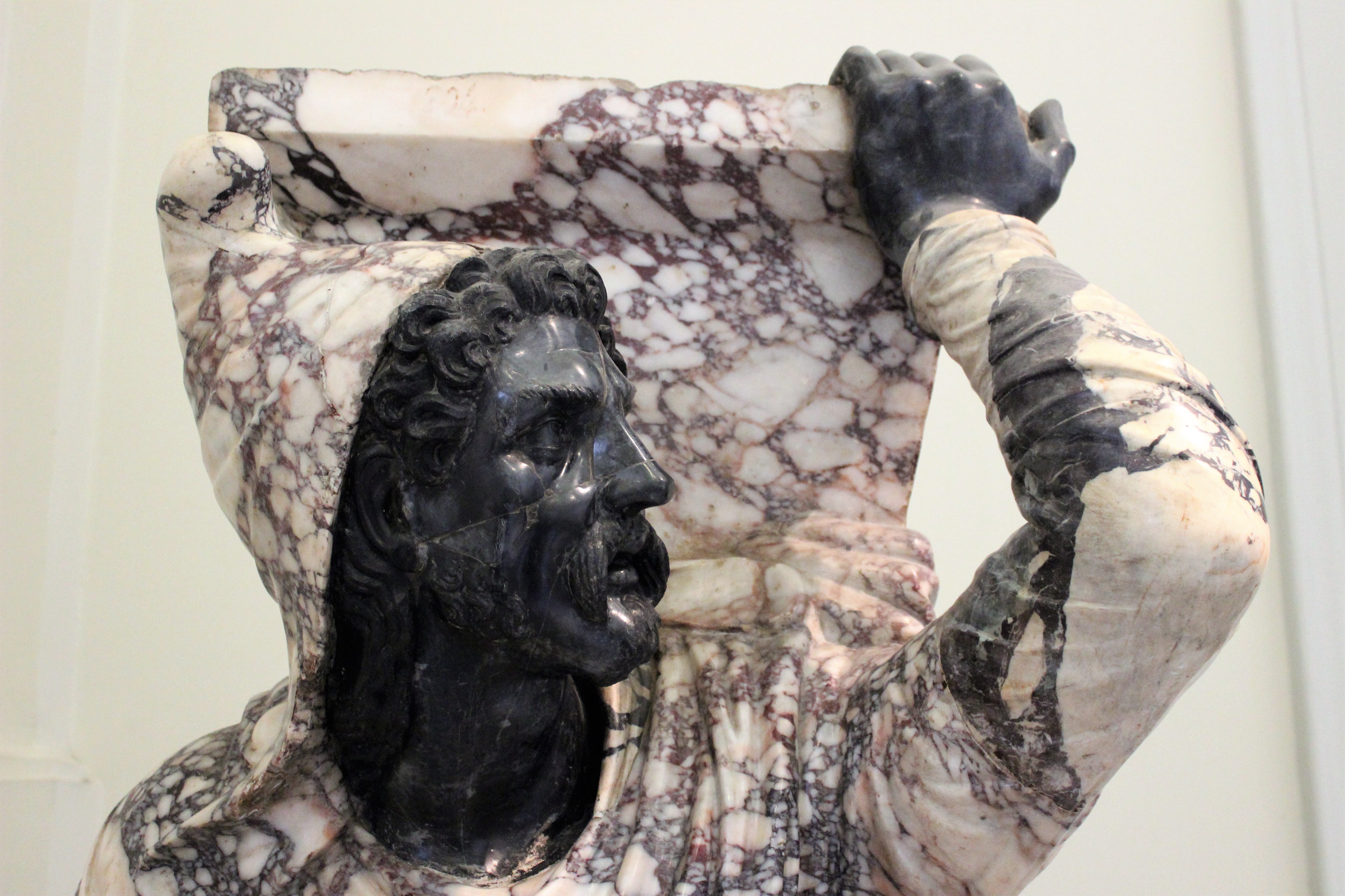Detail of the "Kneeling Barbarian", also known as the "Farnese Barbarian". The use of coloured marbles allowed for a polychromatic sculpture without the use of paint or other pigments. Roman sculpture. c. 98-117 CE. (National Archaeological Museum of Naples)