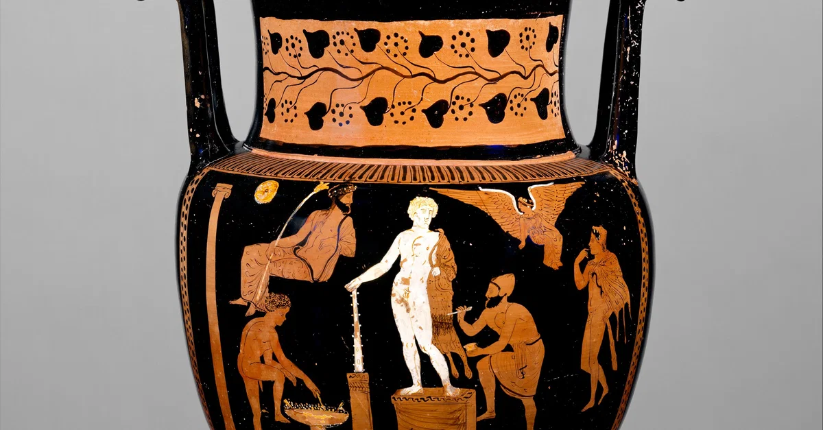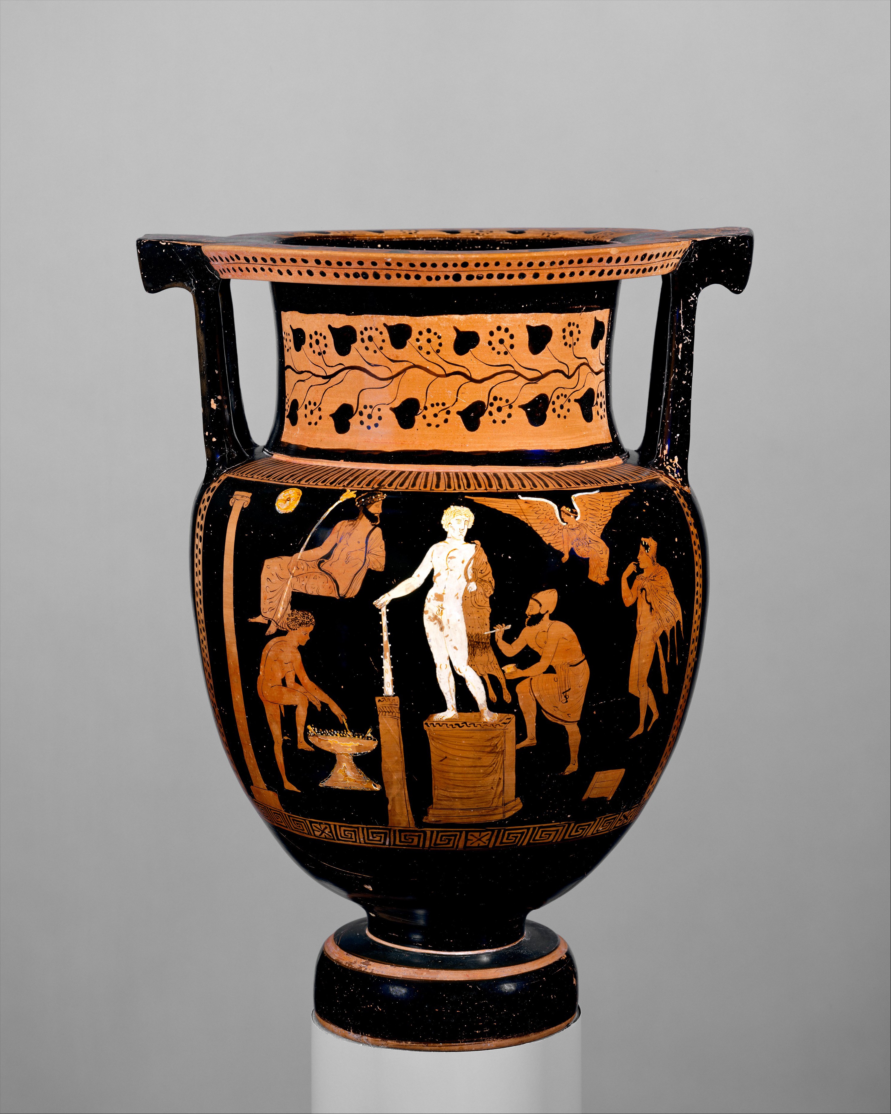 Red-figure vase depicting an artist painting a statue of Hercules, identified by his club and lion-skin cape. Greek and Roman statues were frequently painted in Antiquity, to impart a more impressive and life-like appearance. Images of artists working are extremely rare in ancient art, and this piece provides an insight into an underrepresented trade. Attributed to the Boston Group, c. 360–350 BCE. (Metropolitan Museum of Art)