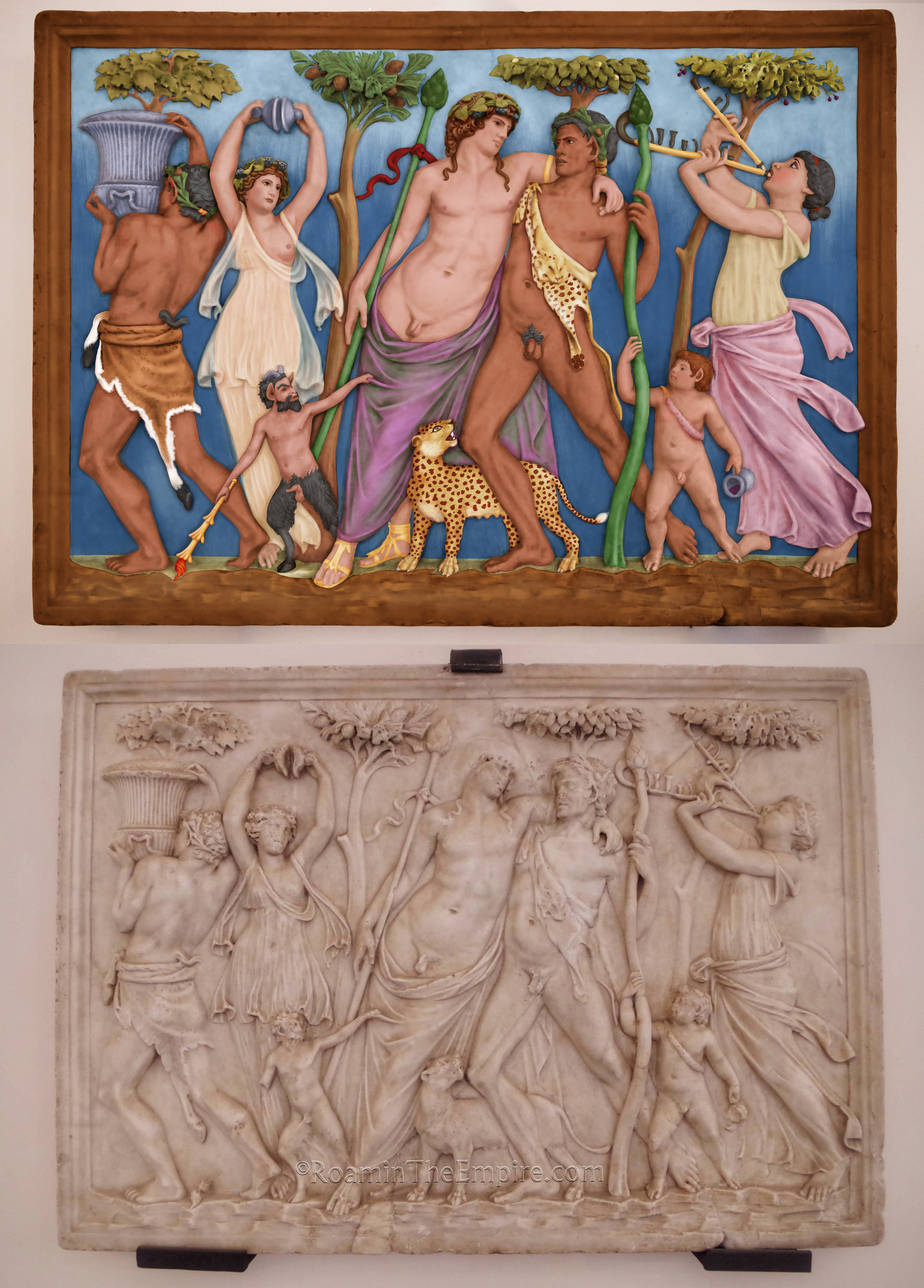 Comparison between a relief of a drunken Dionysus with a digitally restored version. Dionysus leans on a satyr while Maenads dance around him. A small Pan tugs on his robe. This restoration shows the relief in the original colours it was painted with in Antiquity. Restoration by Stephen Chappell, original photo by Roamintheempire. Marble. First half of the 2nd Century CE. 80 cm (31.5 in) x 57 cm (22.4 in). Inv. No. 6684. (National Archaeological Museum of Naples)