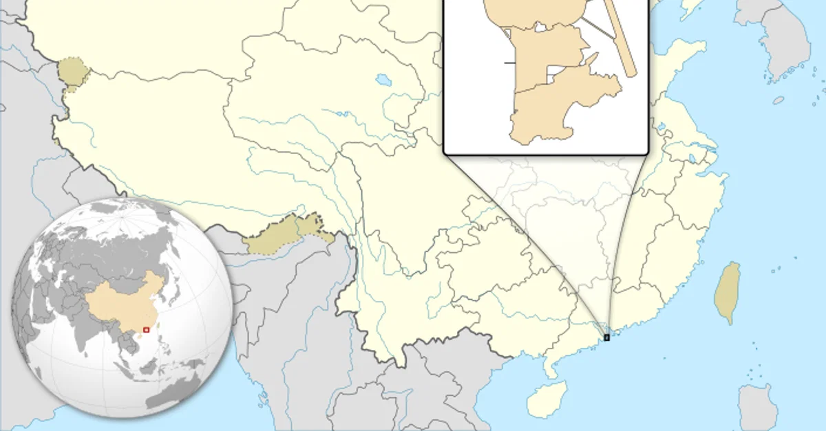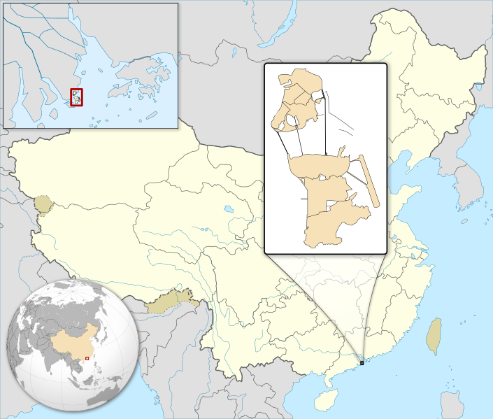 A map showing the location of Portuguese Macao, a colony of the Portuguese Empire from c. 1557 to 1999. Macao is now a part of the People's Republic of China.