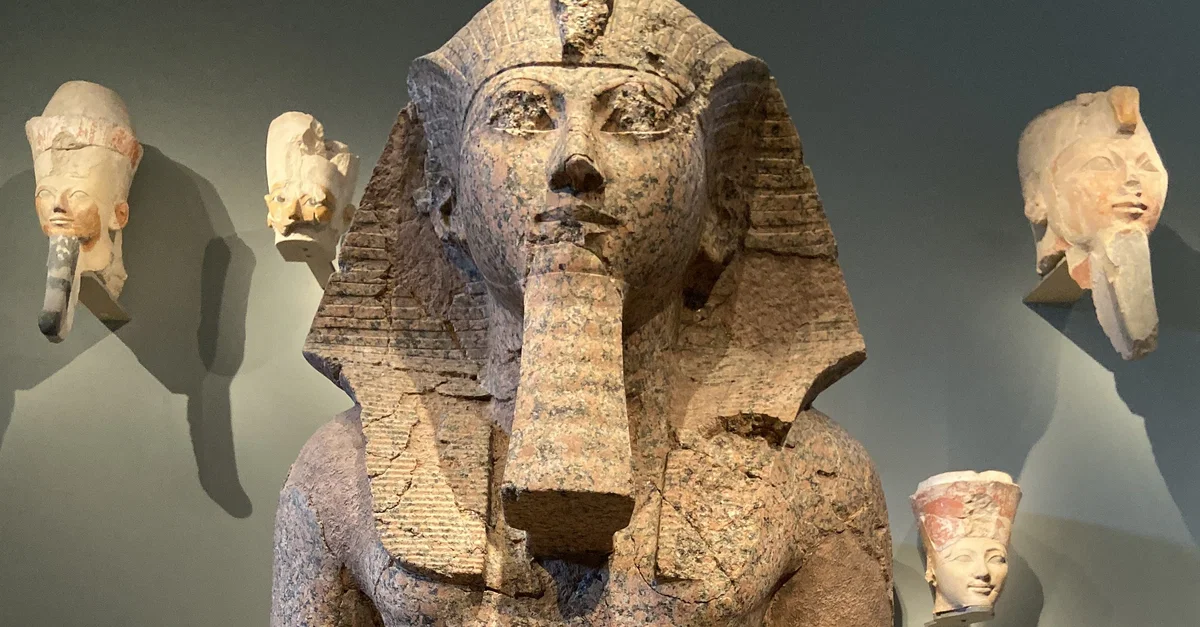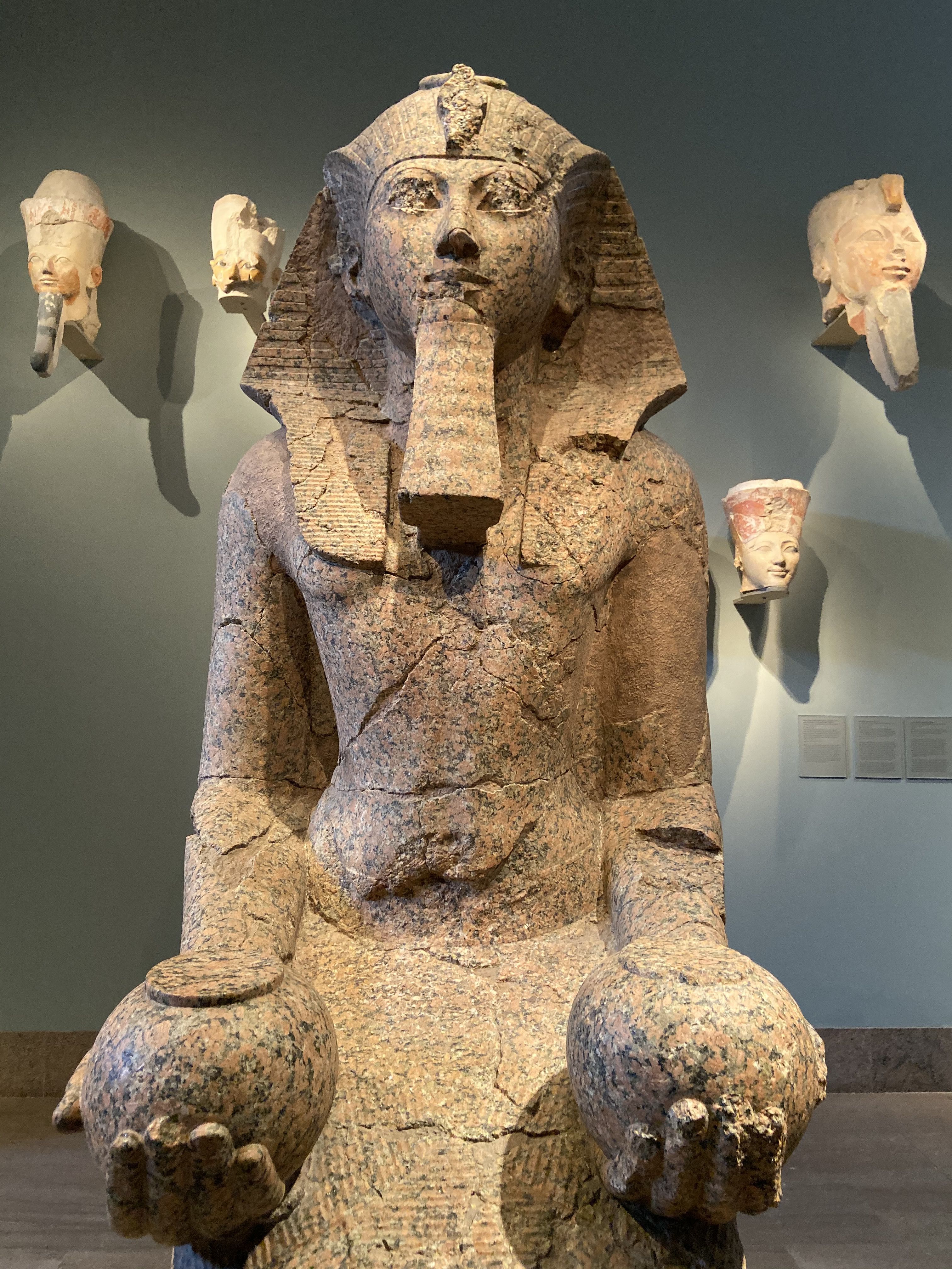 This is a large, kneeling statue of Hatshepsut that was found during excavations of her temple at Deir el-Bahri. In this statue, Hatshepsut is depicted wearing the nemes headcloth, a false beard on her chin, andis kneeling with a nemset jar in each hand. The headcloth and false beard was not representative of Hatshepsut trying to be a male, it followed traditional depictions of the pharaoh in Egyptian statuary.