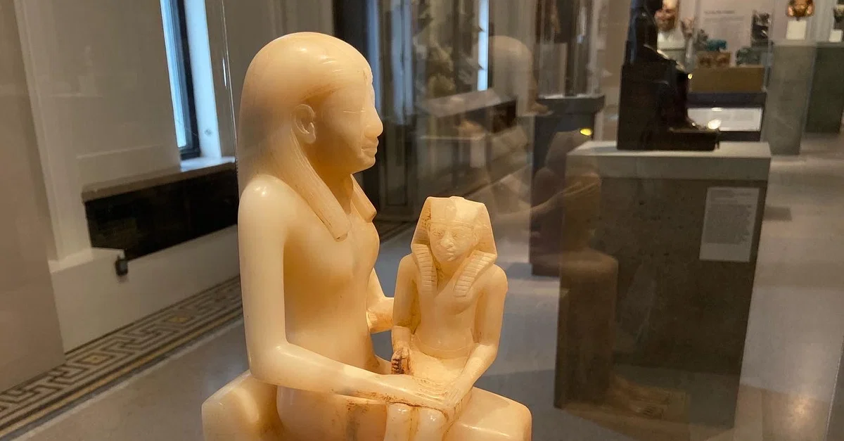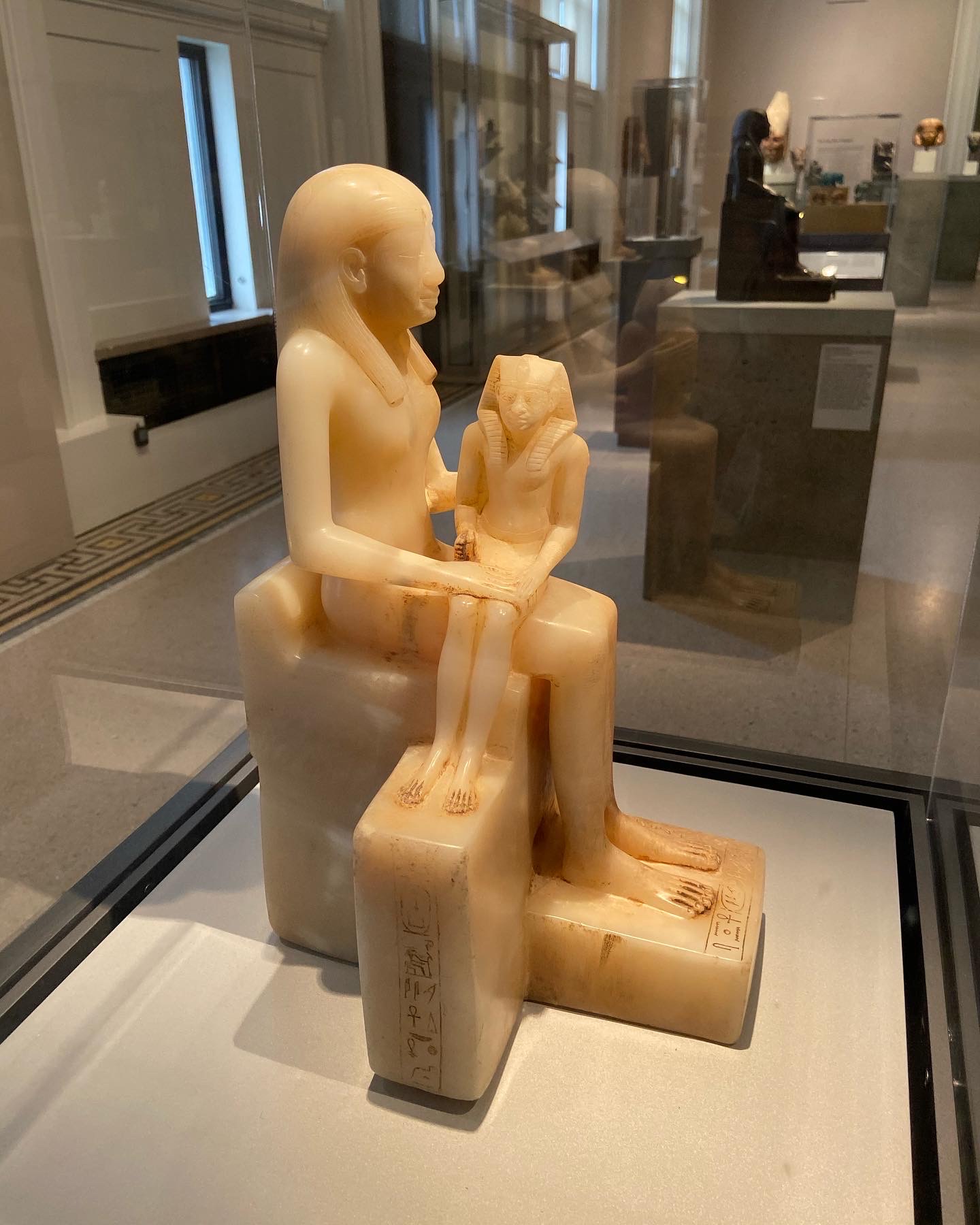 This alabaster statue of Pharaoh Pepi II (2284 - c. 2216 BCE) and his mother, is one of the more famous representations of the two because the statue technically has two “front” sides. By placing Pepi II and his mother in opposite directions, it creates a multi-view statue. This is a very different statue style from other Old Kingdom art, and diverges from typical Egyptian styles in general. 6th Dynasty, Old Kingdom. (Brooklyn Museum)