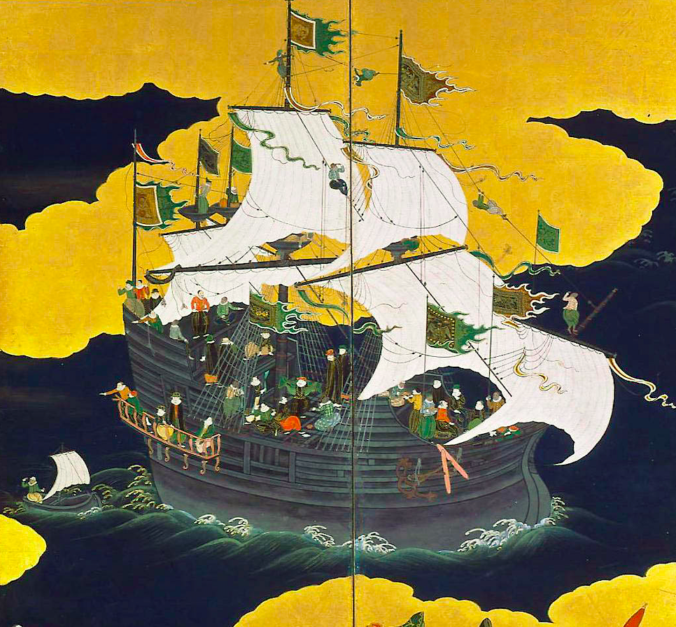 A detail from a Japanese painted screen showing a Portuguese carrack at the port of Nagasaki, a Portuguese trading post from c. 1571 to 1639. Screen painted by Kanō Naizen. (Kobe City Museum, Japan)