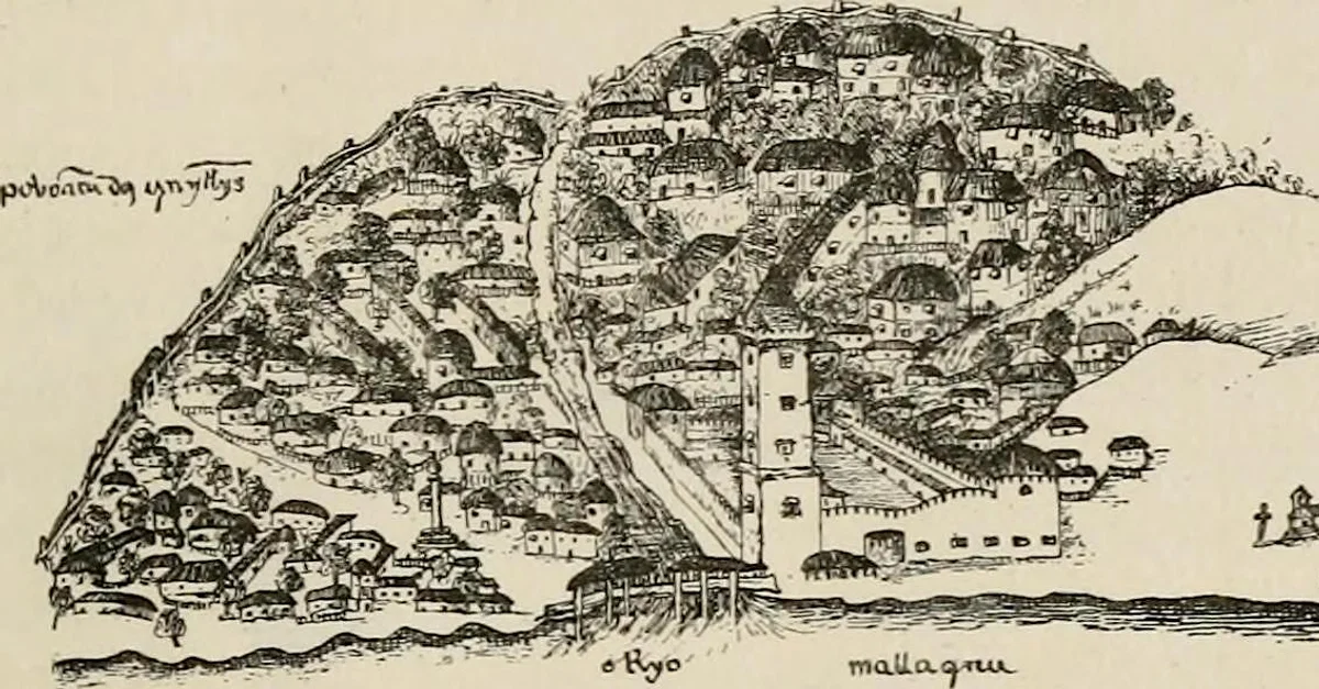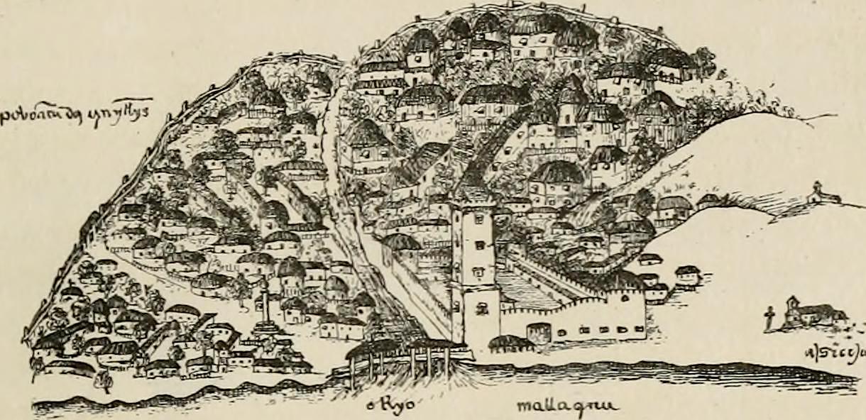 A drawing showing Portuguese Malacca in Malaysia. The colony was Portuguese from 1511 until 1641. (From The Life of Ferdinand Magellan and the First Circumnavigation of the Globe : 1480-1521, by Guillemard, F. H. H. et al, published in 1891 by George Philip & Son).