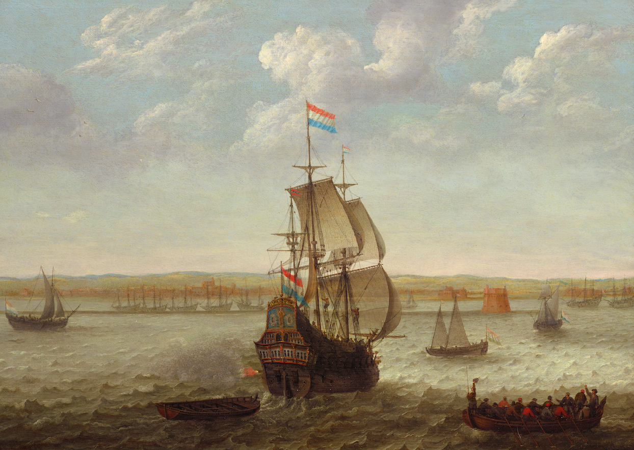 A c. 1640 painting showing a Dutch ship in the harbour of Recife, Portuguese Brazil. Painted by Abraham Willaerts. (Het Scheepvaartmuseum, Amsterdam)
