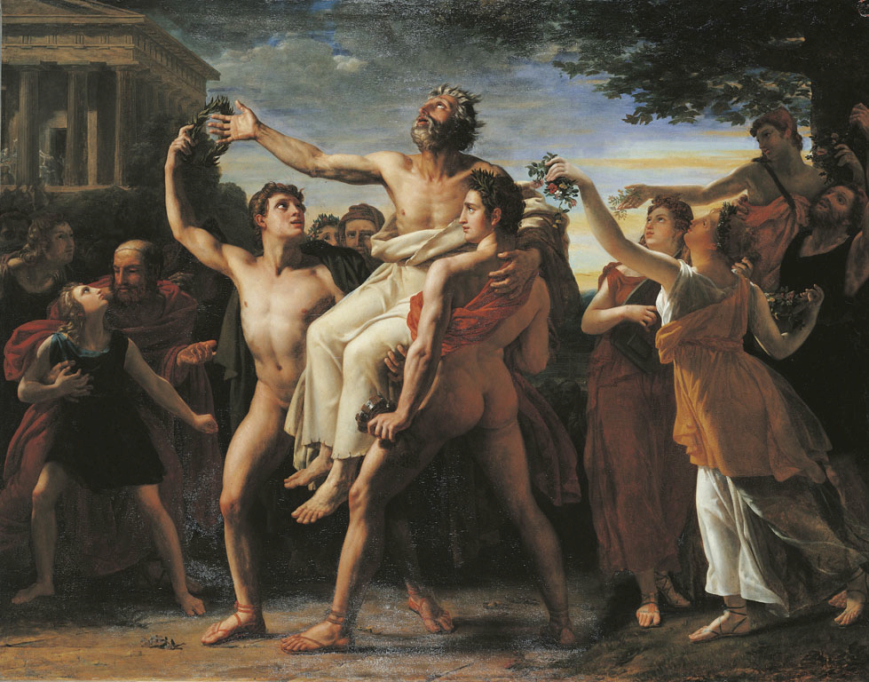 Diagoras is carried by his two sons after an Olympic victory, painting by Auguste Vinchon, 1814.