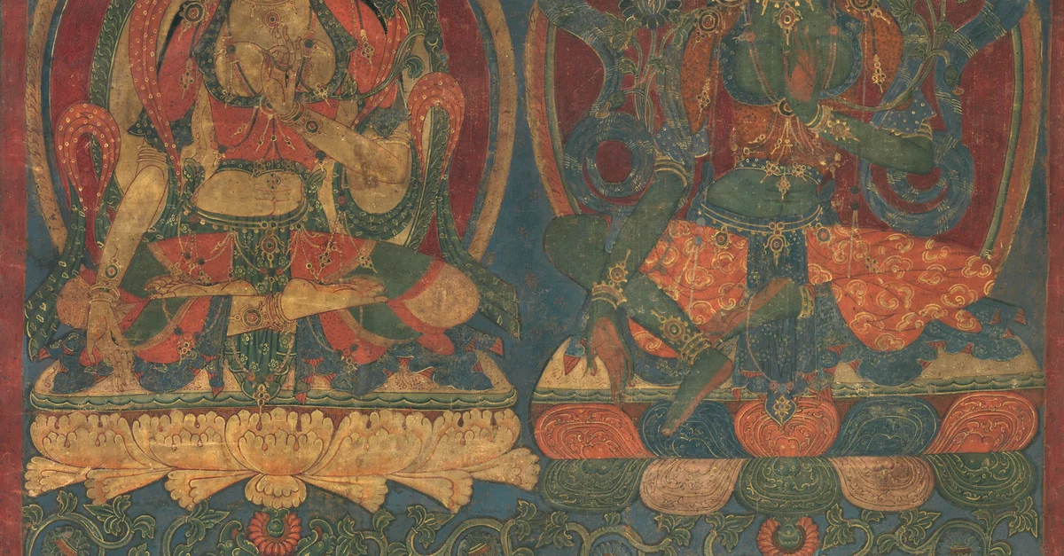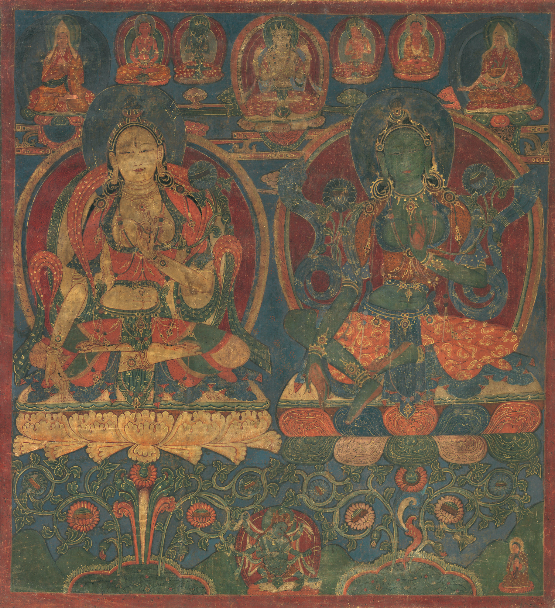 White Tara and Green Tara, distemper on cloth painting, 1450-1500, Guge, Western Tibet.